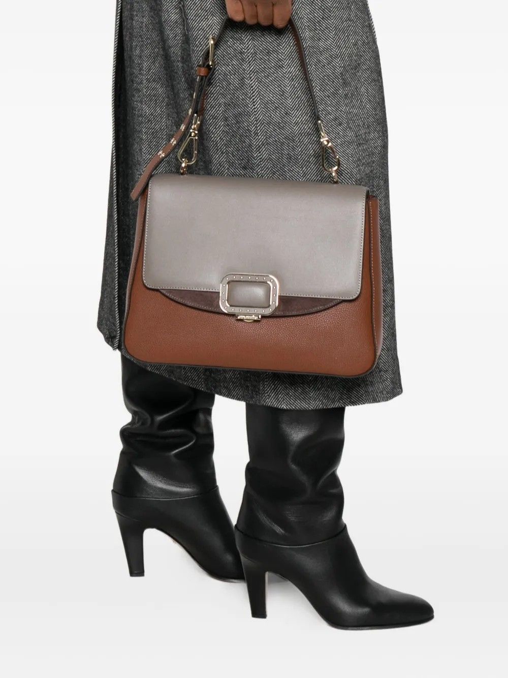 The Grace shoulder bag is crafted from smooth and suede calfskin leather with a structured silhouette that enhances its clean, essential lines.The adjustable strap allows for personalized wear over the shoulder or crossbody,while the flap closure adds an elegant and functional touch.Gold-tone metal details brighten the design with a sophisticated finish.The internal compartment provides practical space for everyday essentials.Measures 22 cm in height,29.5 cm in width and 10 cm in depth.