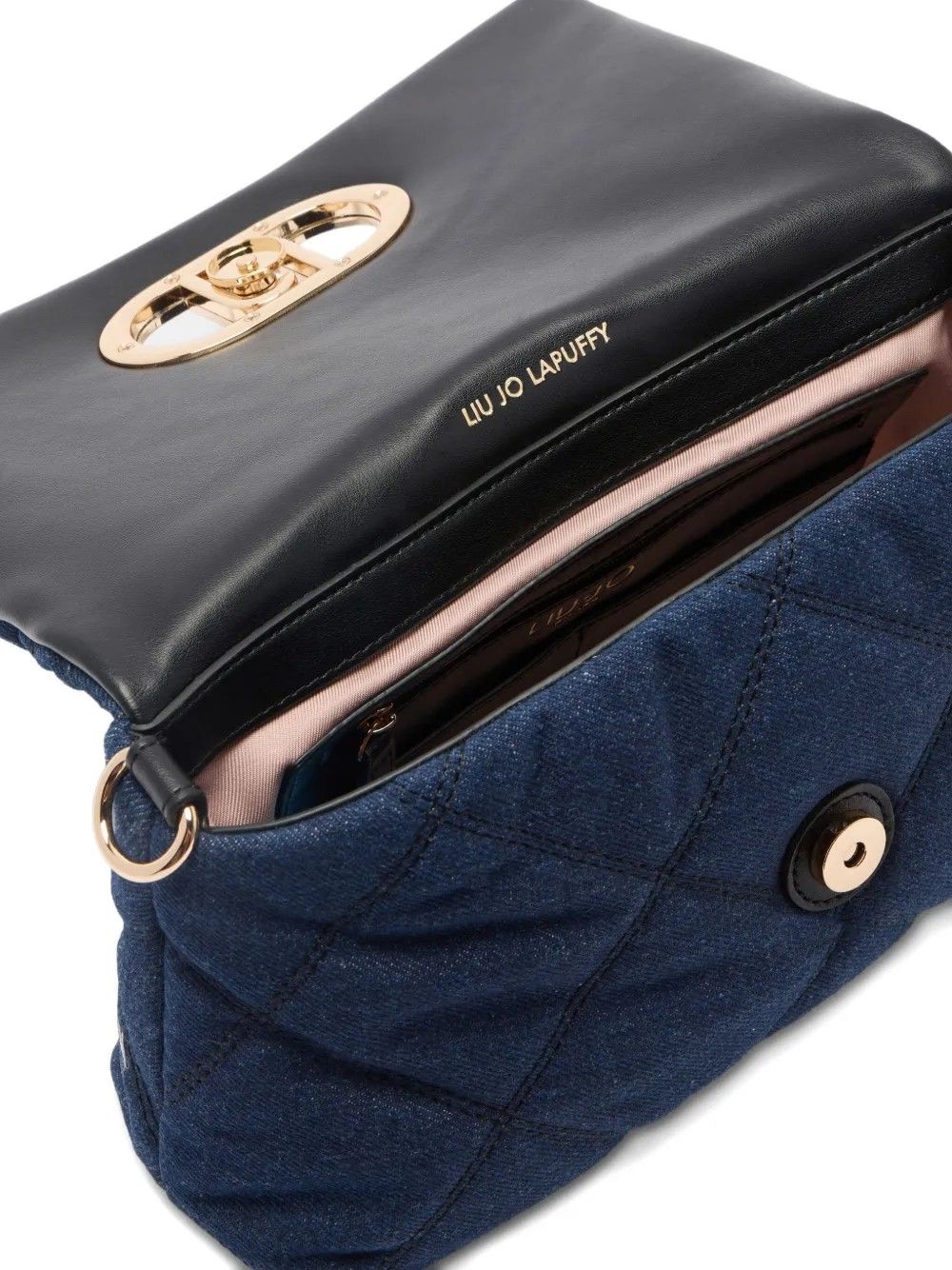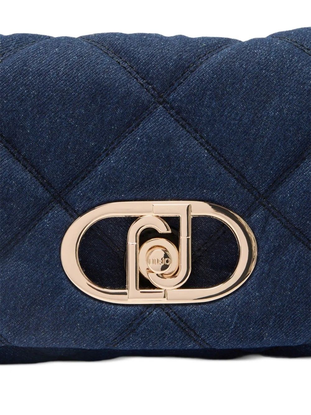 Quilted denim shoulder bag with a modern and versatile look.Structured design with metal logo for a distinctive touch.Removable chain handle and adjustable strap for multiple uses.Flap closure with magnetic button for practical wear.Well-finished inner lining for functional comfort.Dimensions: 28 x 8 x 16 cm.