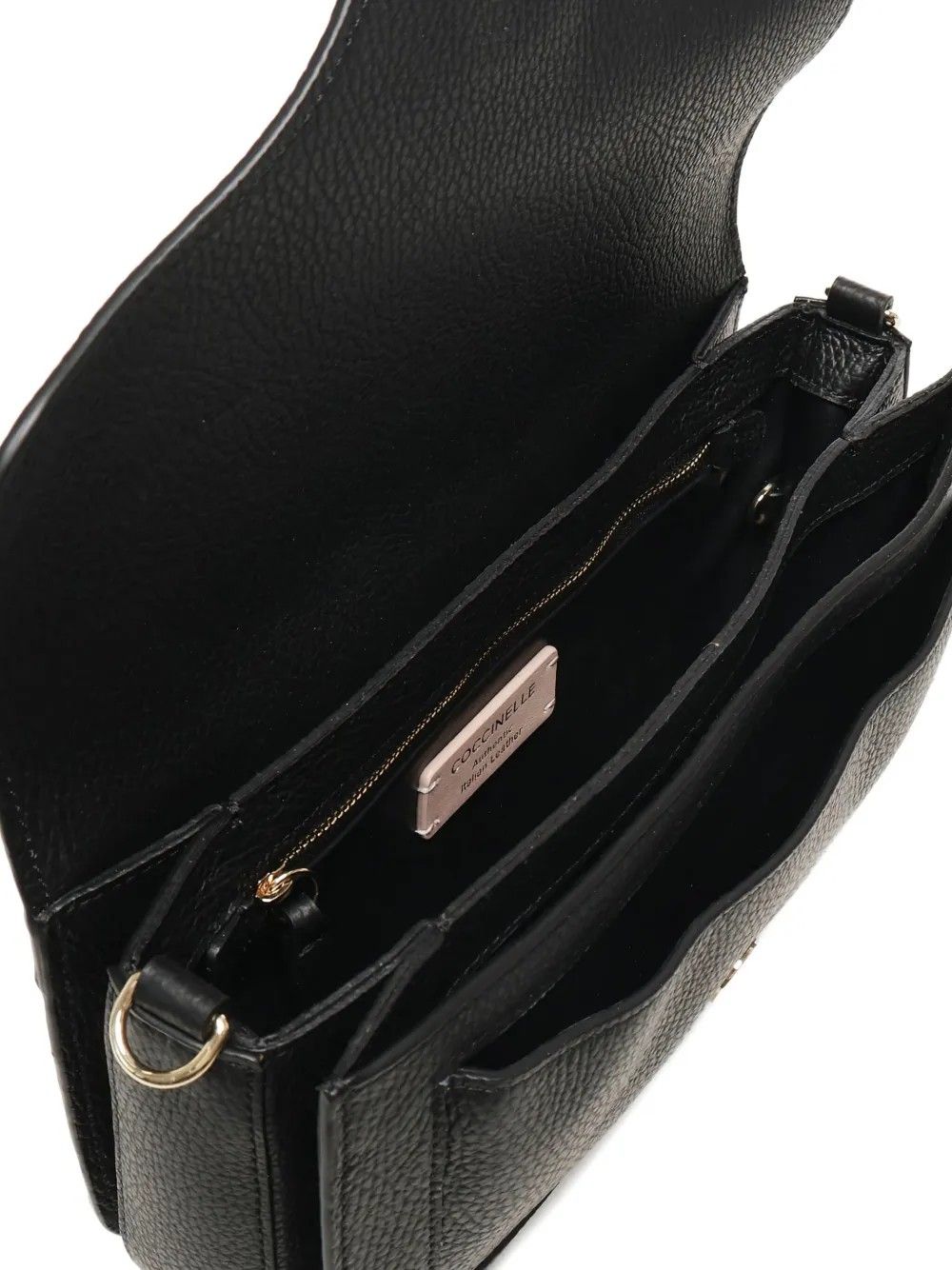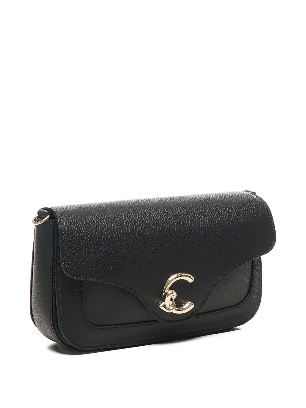 Coccinelle C-Me bag crafted from leather with a structured shape and curved lines that enhance its geometric design.The flap with magnetic button and the adjustable, removable strap offer practical versatility.The compact and balanced proportions make it perfect for any occasion.The elegant silhouette is signed by the embossed C-Me logo, a hallmark of the line.A bag with strong visual identity blending style and functionality.Size 26x14.5x7 cm.