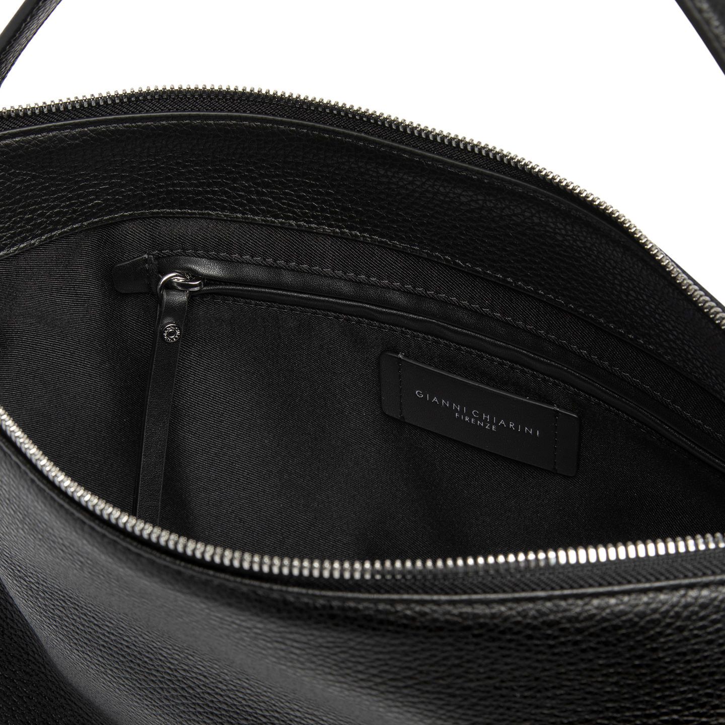 Brina by Gianni Chiarini Firenze is a hammered leather bag featuring clean, squared lines. Knotted details and metal accents add a subtle shine. It includes a leather handle for comfortable shoulder wear and an adjustable, removable shoulder strap for crossbody use. The top zip closure offers practicality and security. Size: 32x28x11 cm.