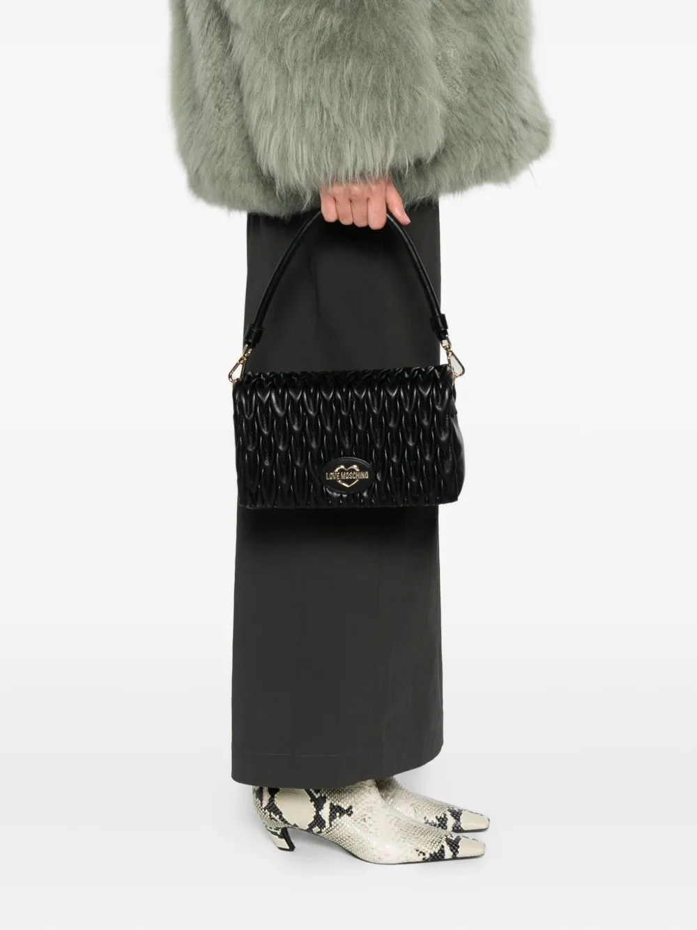 Love Moschino shoulder bag with quilted design and front logo.Removable handle and strap for versatile styling.Magnetic closure offers practicality and security.Compact yet spacious, perfect for everyday use.Made from polyurethane with refined finishes.Dimensions: 24×14×7 cm.