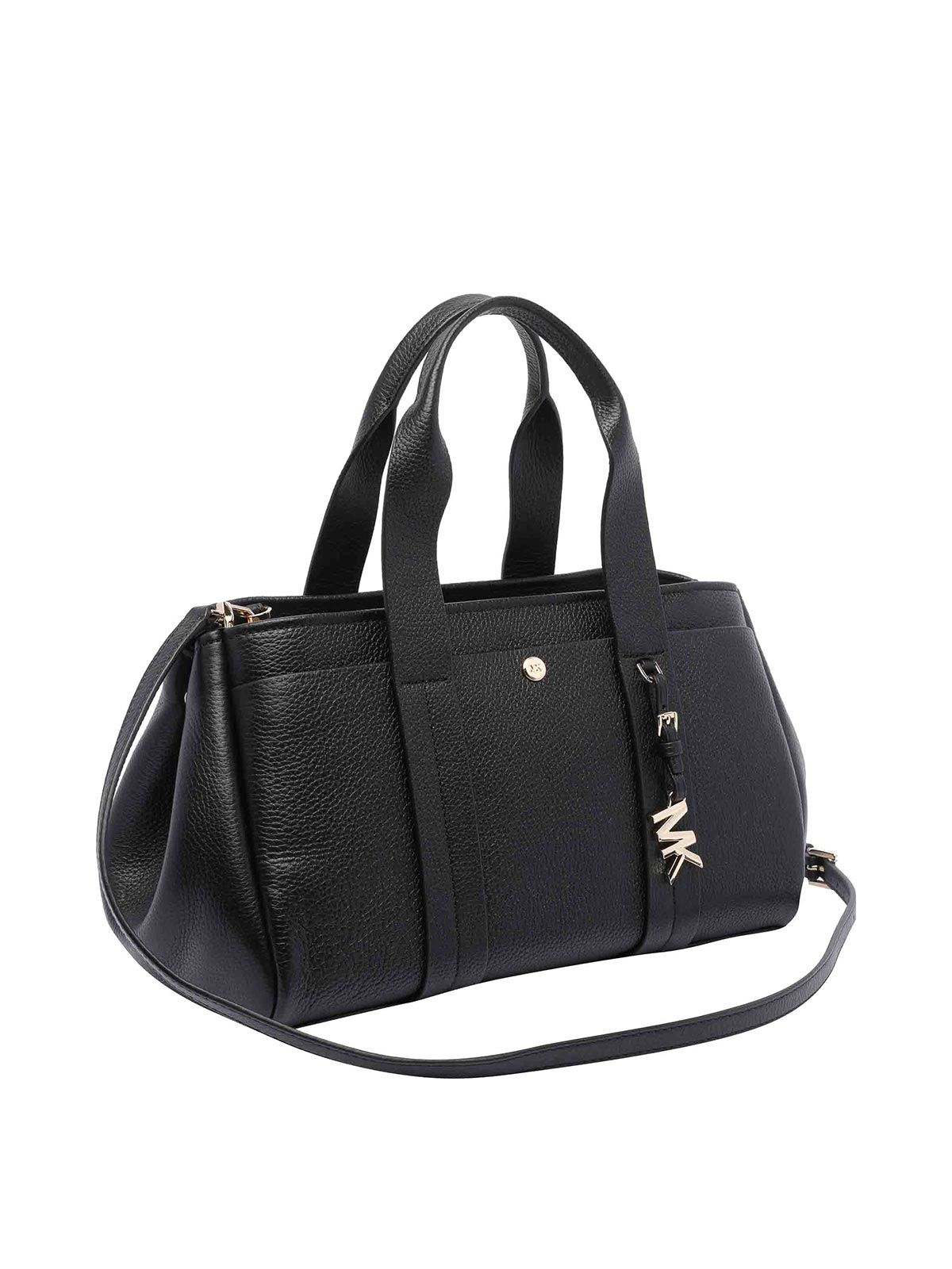 Satchel bag crafted from 100% calfskin leather with double top handles and an adjustable, removable shoulder strap.Front pocket with magnetic closure for quick access.Side pleats with button add design detail.Top zipper closure and inner pouch pocket.Metal feet at the base for added protection.Finished with metal logo pendant and measures 36.5x25.5x18 cm.