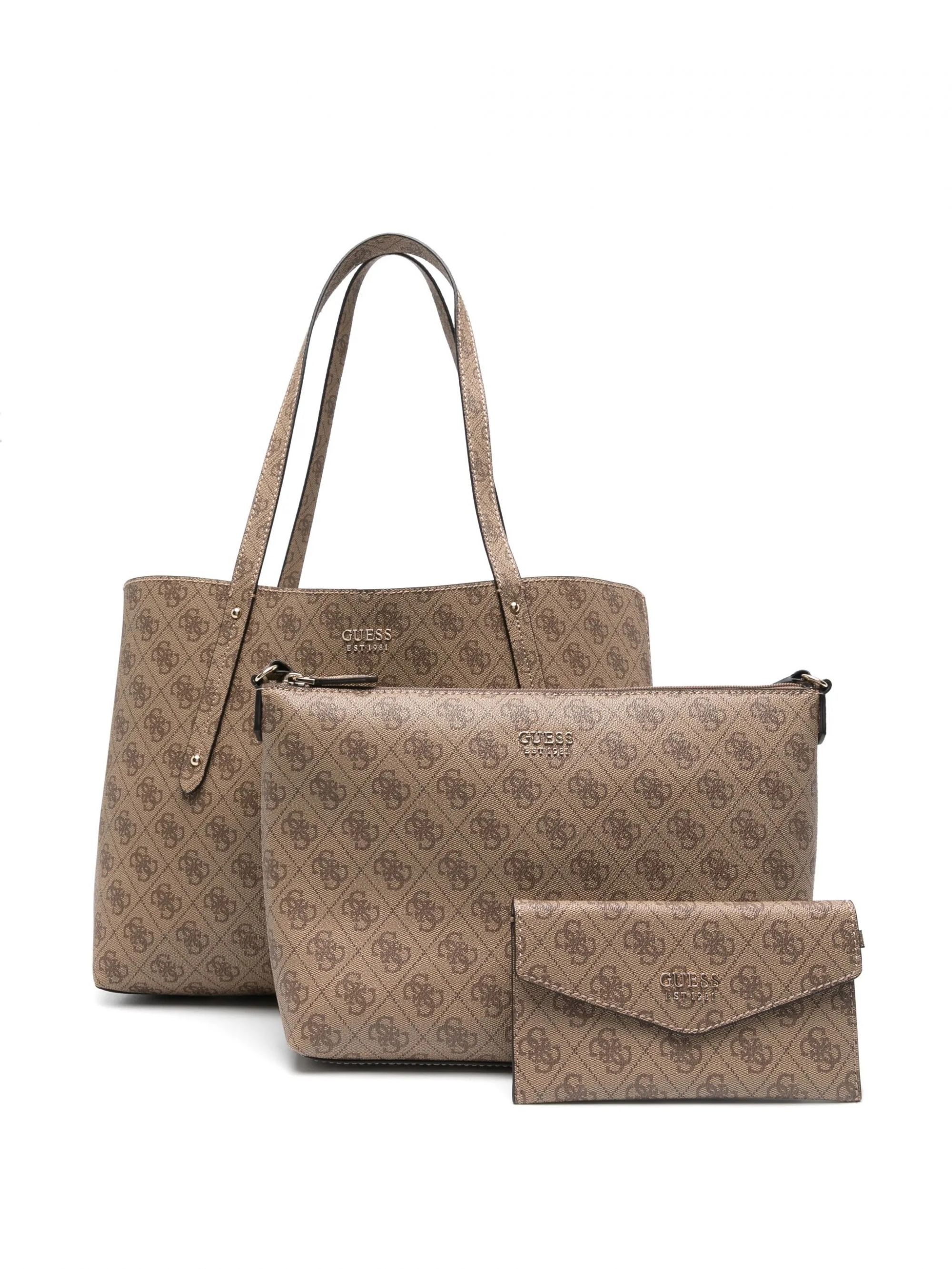Guess shopper bag made of synthetic leather with pale gold-tone hardware and 4G logo print that defines the design features a clasp closure for easy and secure access includes an internal zip pouch and a removable charm pouch attached at the base of the handle interior lining customized with logo and front metal logo lettering complete the look with a distinctive style perfect for adding elegance and functionality to everyday use.