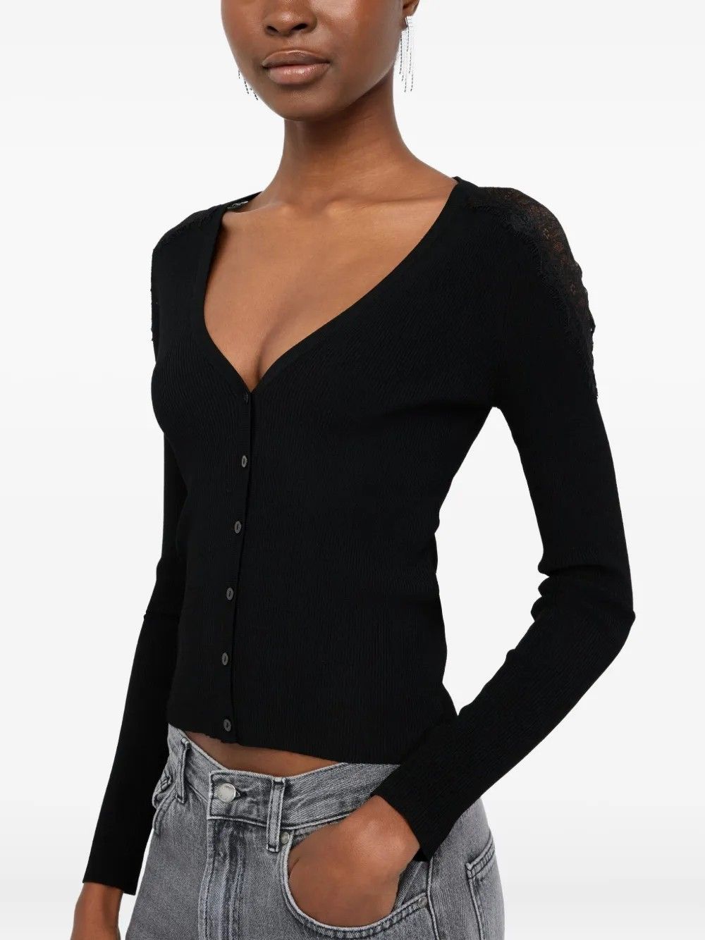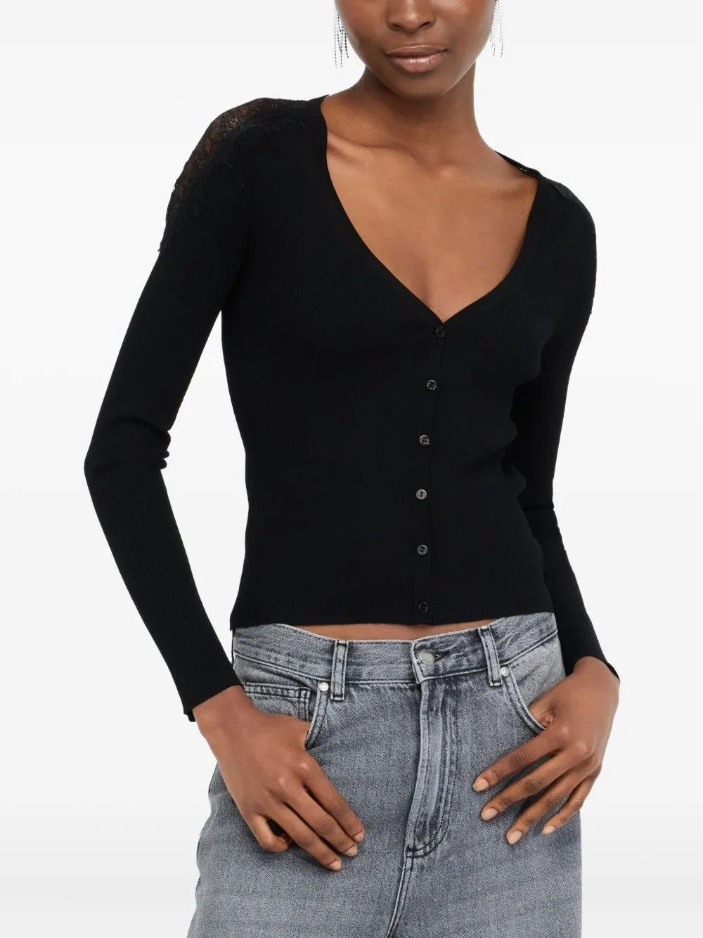 Lightweight knit women’s cardigan with sheer lace inserts for a romantic and refined touch.Clean lines and a soft cut enhance the silhouette with elegance.Regular fit makes it ideal for any occasion, from office wear to formal events.Finely finished edges reflect the high quality of Liu Jo garments.Strategically placed lace details enhance femininity with subtle charm.Perfect for all seasons, adding a distinctive and feminine touch to any outfit.