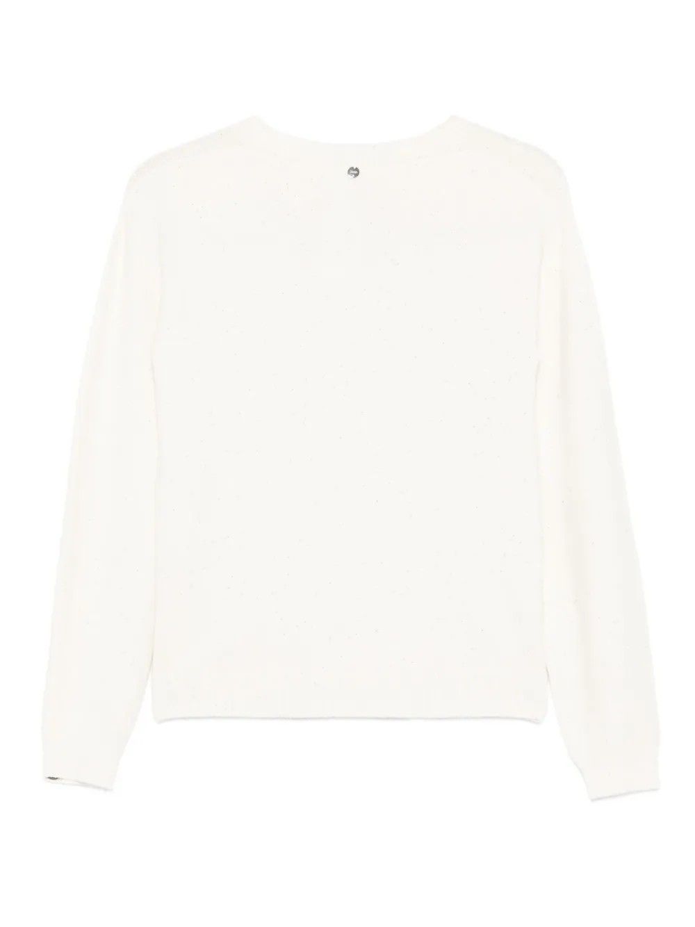 Sweater made in Italy from a viscose, polyester, and polyamide blend for a soft, luminous texture. Glittered effect and sequin appliqués add a refined, radiant touch. Classic crew neck and feminine cut for an elegant fit. Features logo on the back and inside. Perfect for the Fall/Winter season. A polished piece for sophisticated looks.