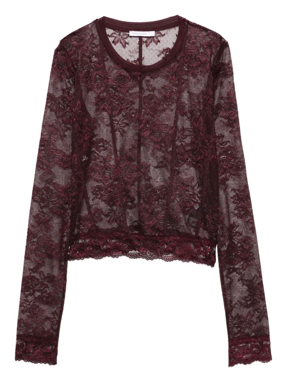 Stretch lace blouse featuring an elegant floral pattern.Scalloped hem adds a refined and feminine detail.Long sleeves and round neckline offer a balanced design.Soft, elastic fabric gently hugs the silhouette.Perfect worn alone or layered under tailored jackets.Elegant style ideal for both versatile and sophisticated looks.