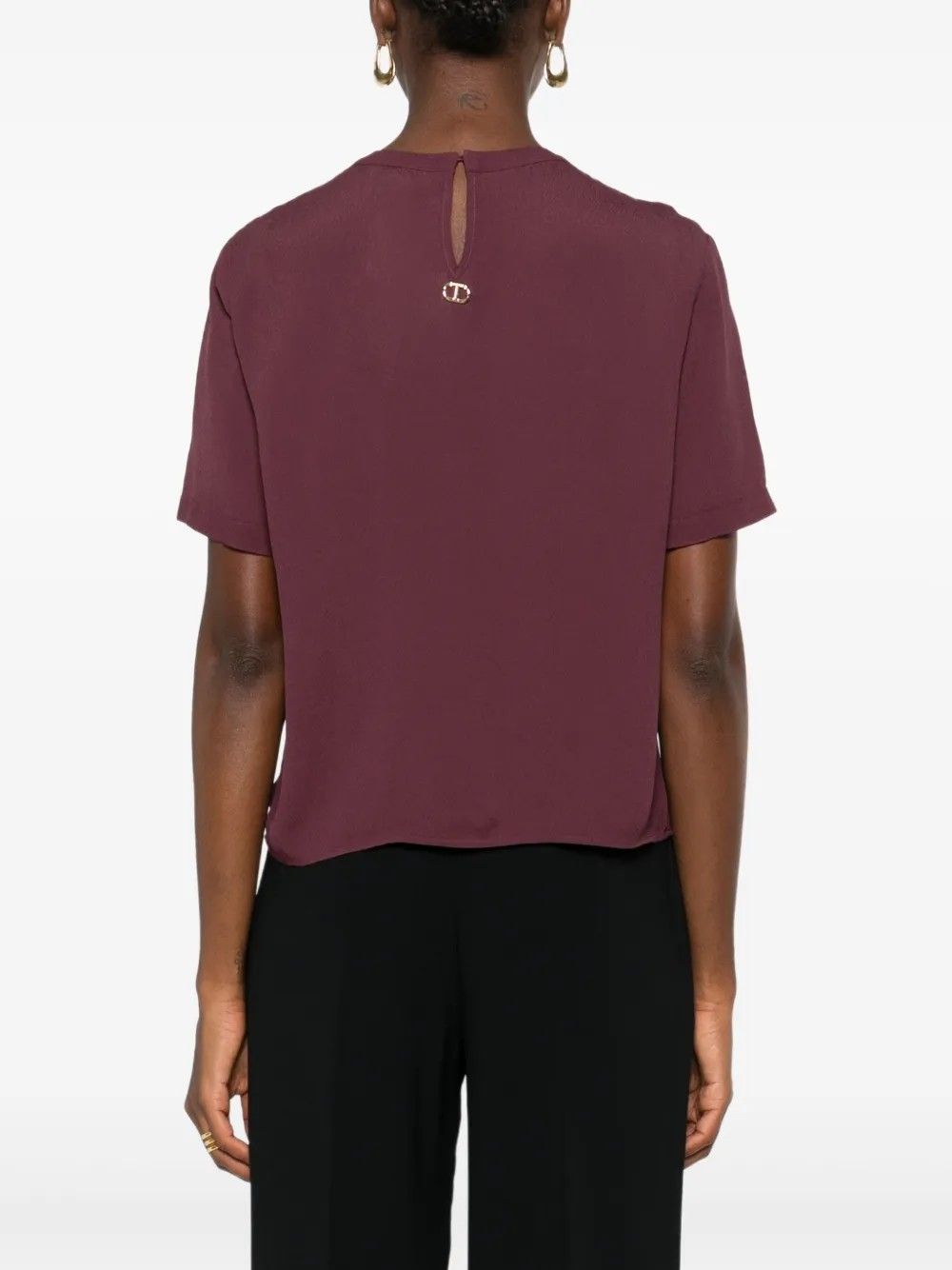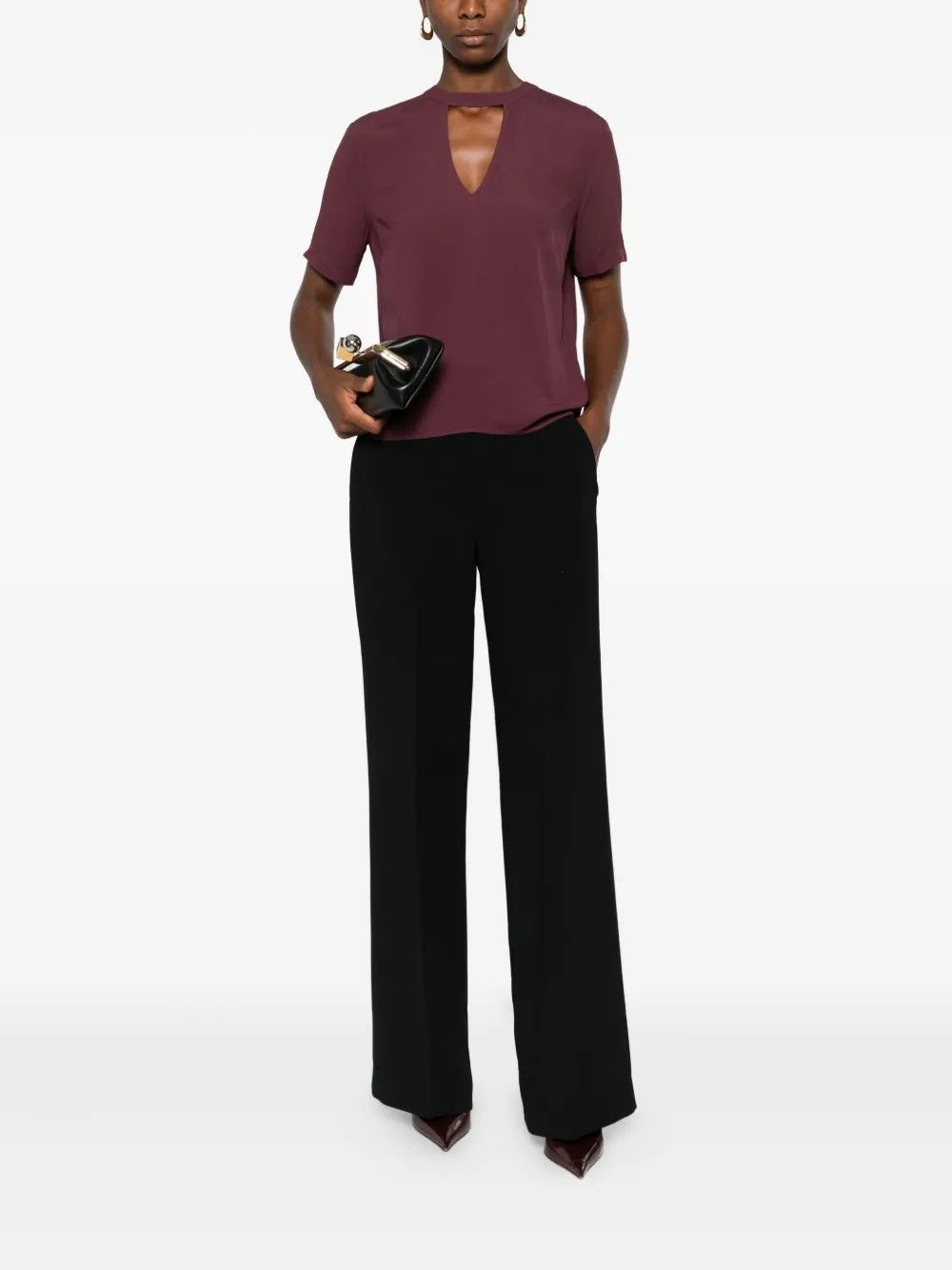 Blouse in crĂªpe de Chine with front V cut-out for a refined touch.Round neckline and keyhole opening with covered button at the back.Relaxed fit ensures comfort and femininity.Short sleeves for an essential and versatile style.Fluid fabric adds elegance and lightness.Ideal model for daytime or office looks.