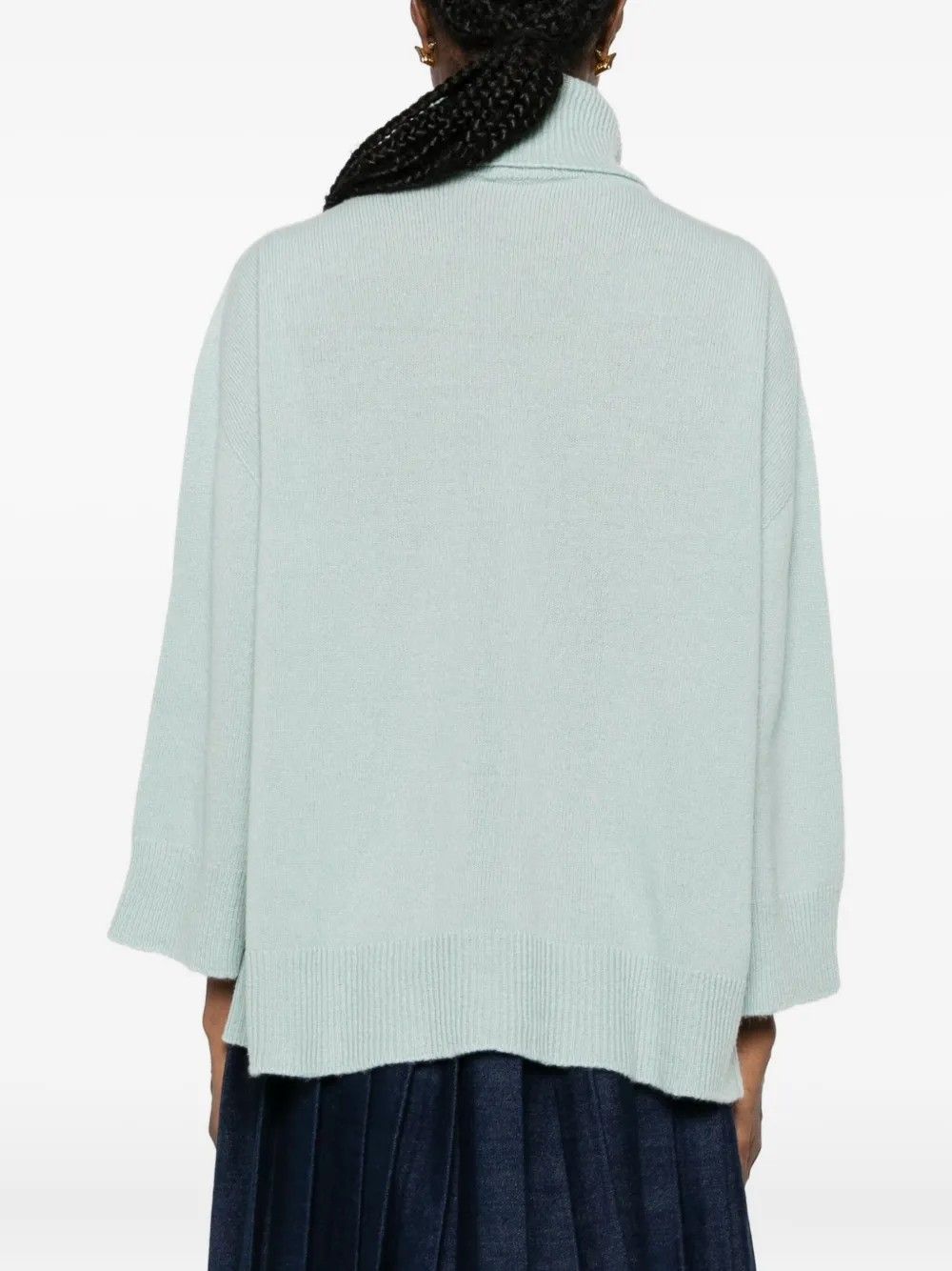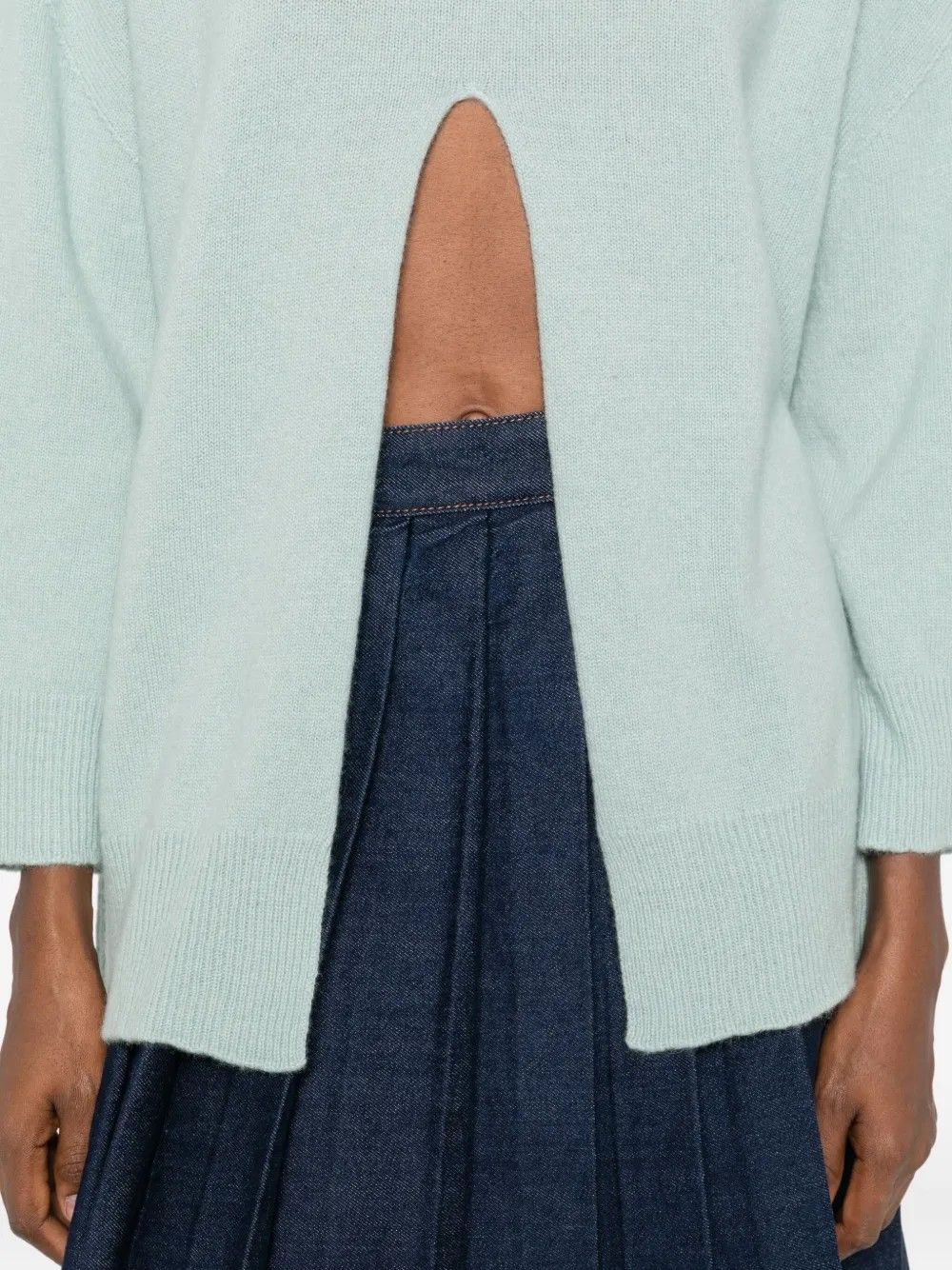 Sweater with a unique and feminine design,featuring a front slit at the waist for a bold,modern touch.High neck and long sleeves provide warmth and comfort during colder days.Made from 100% fabric,it combines softness and coziness with a distinctive style.A versatile piece that reimagines a classic with an unexpected detail.