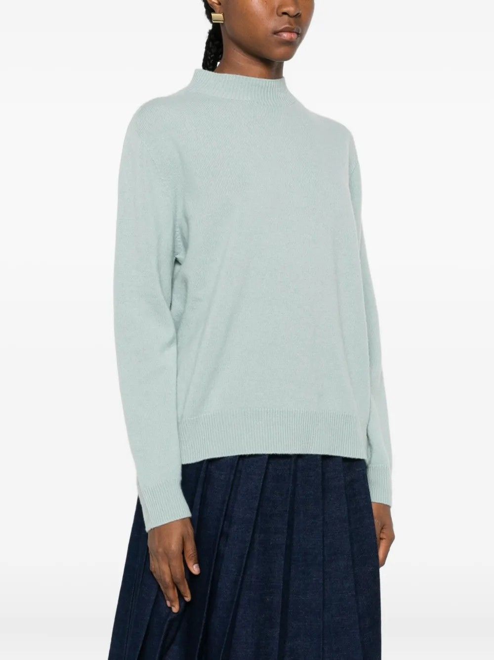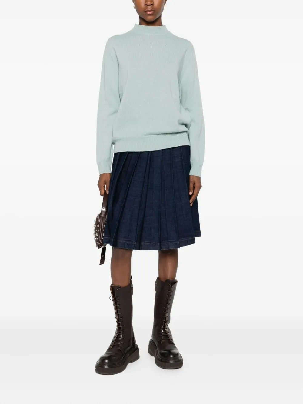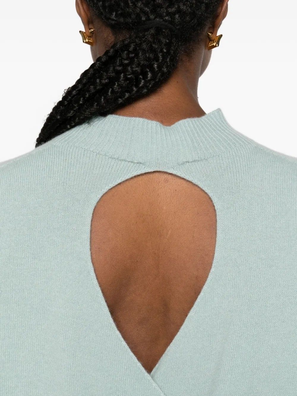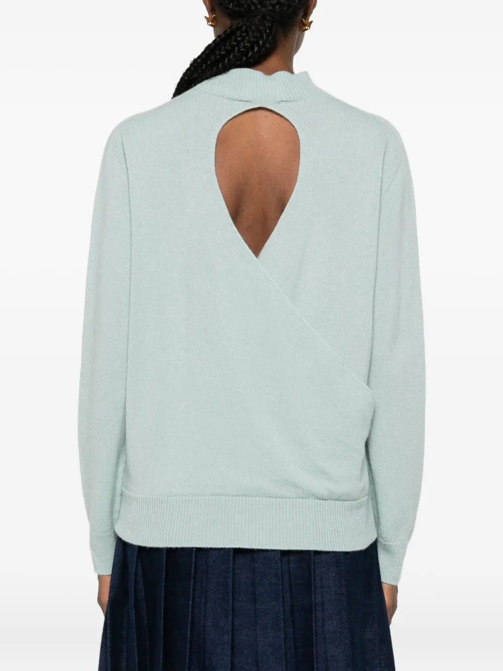 Sweater with a minimal design and an unexpected twist,featuring a deep back neckline that adds femininity and modern flair.High neck and long sleeves bring balance to the silhouette,while ribbed hems give it structure.Made from 100% fabric,it ensures comfort and a cozy fit.A versatile piece perfect for day-to-night looks.