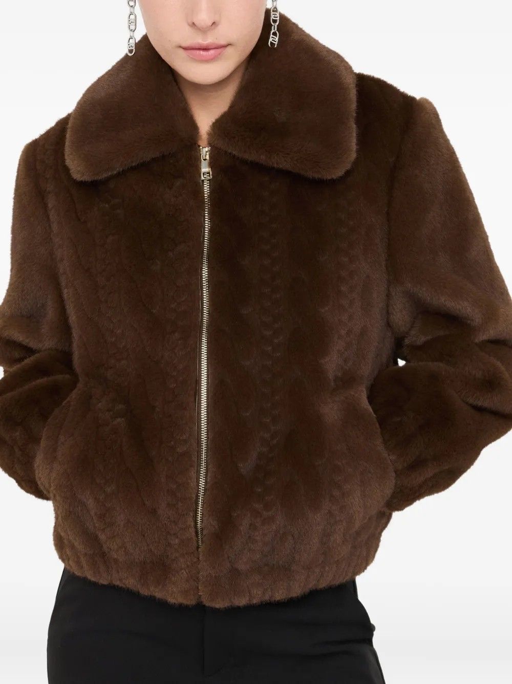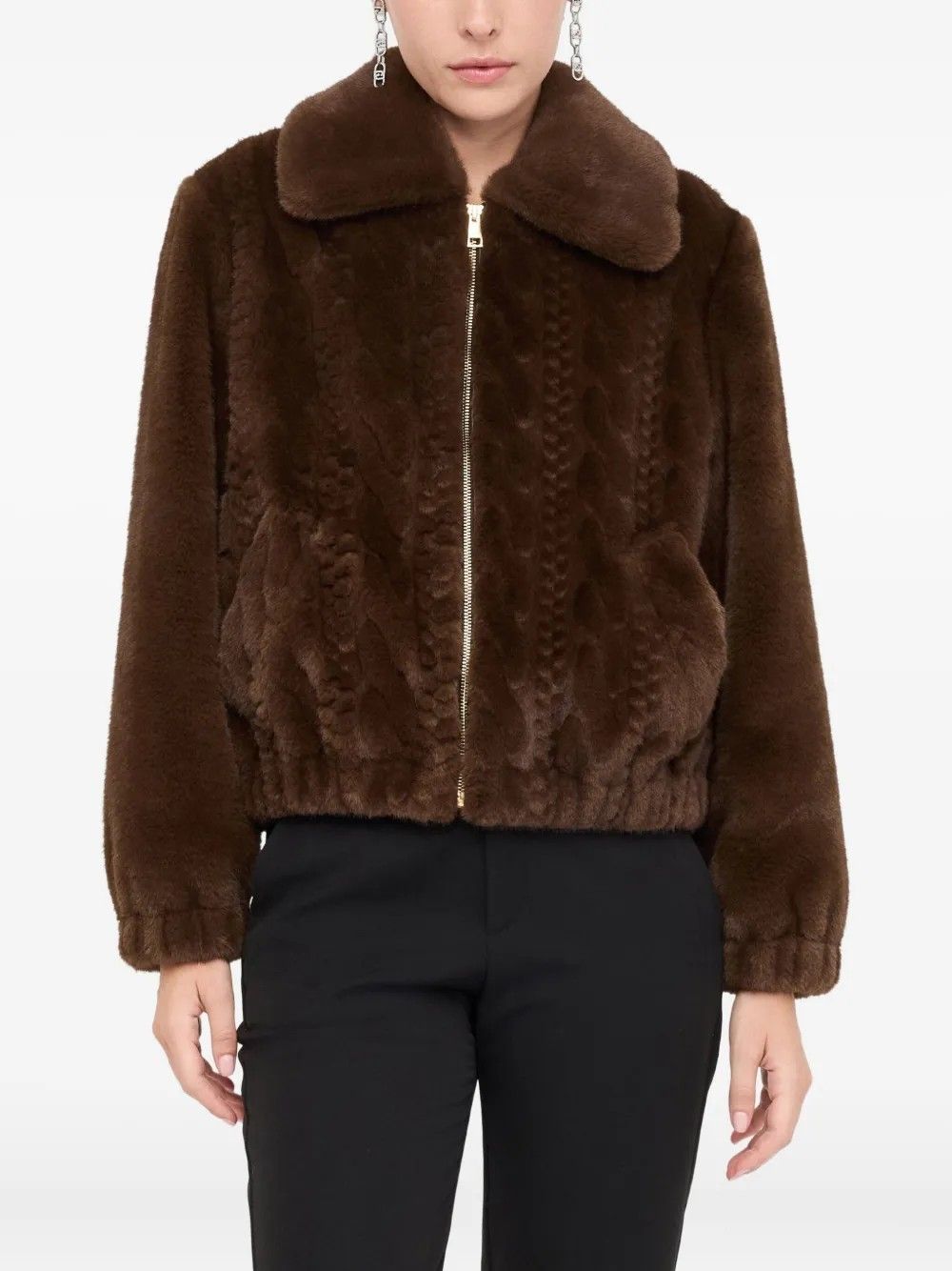 The Liu Jo Teddy fabric jacket combines an intricate knit with soft, cozy details. Featuring a zip closure and elasticized hems, it blends functionality and contemporary style, perfect for a casual and comfortable look.