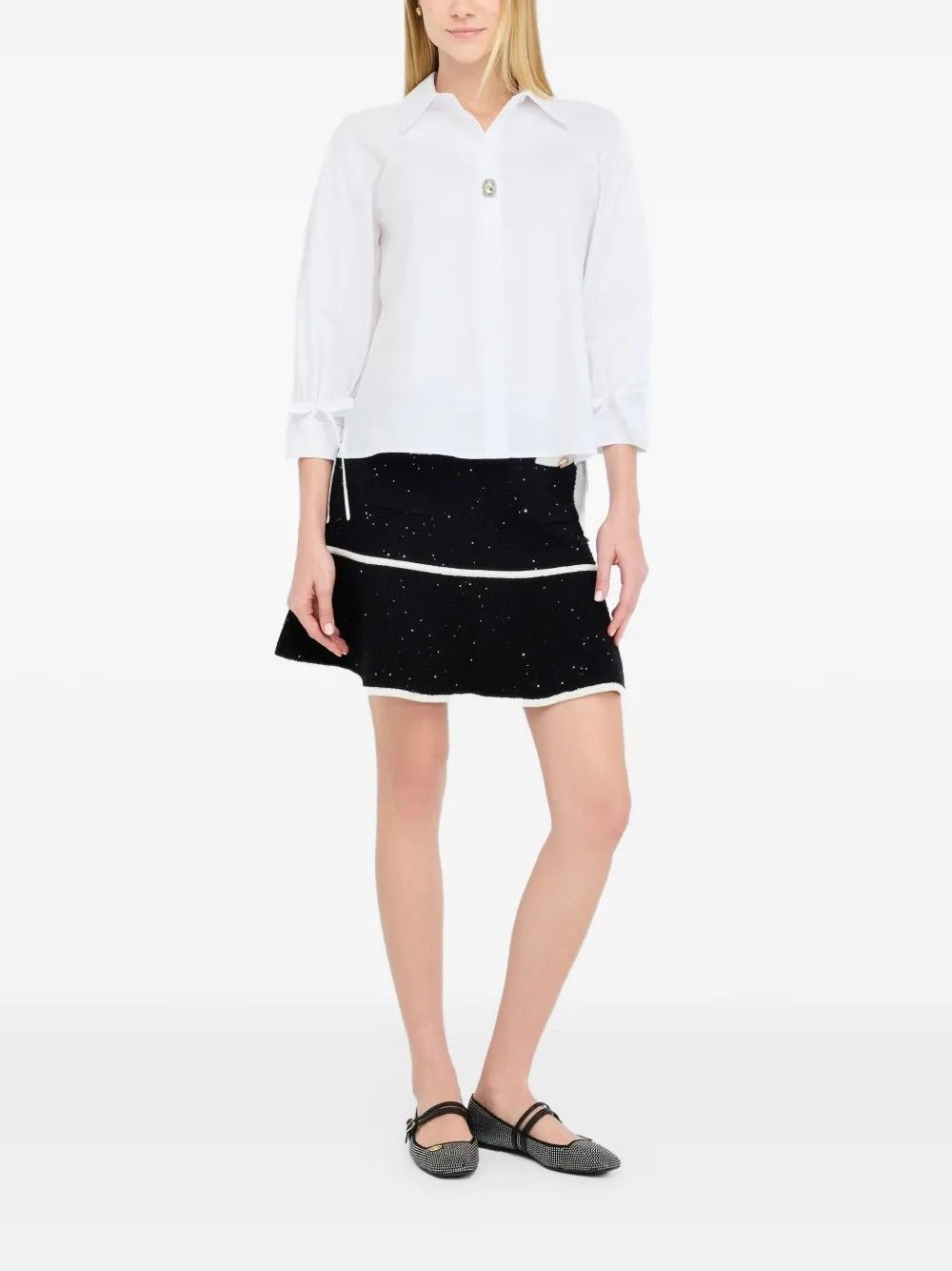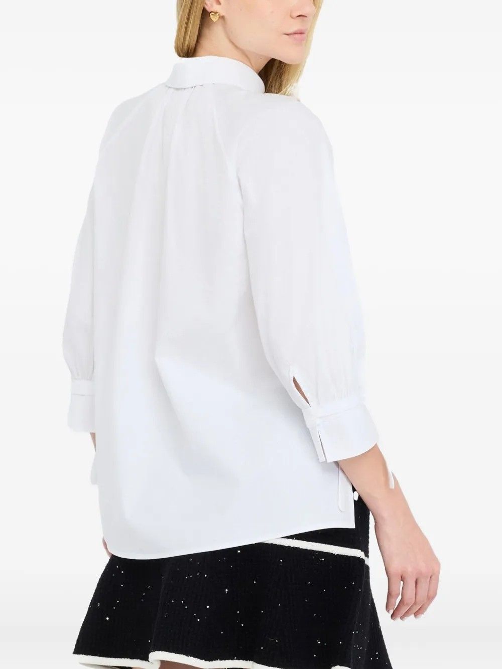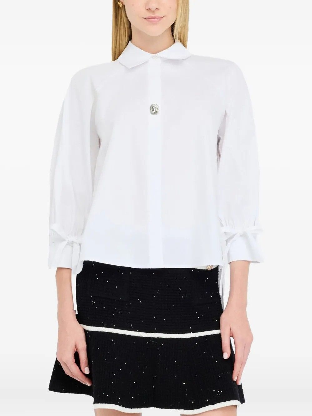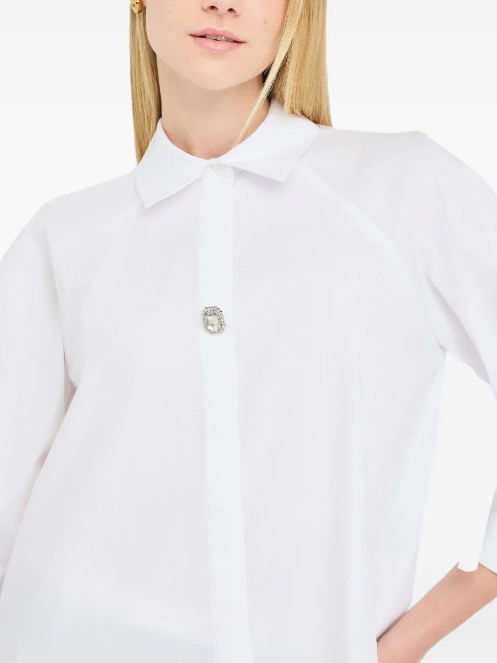 Camicia in popeline di cotone con strass gioiello applicati.Colletto alla francese e maniche raglan 3/4 con laccetti al fondo.Orlo più lungo sul retro per un tocco moderno.Chiusura con bottoni nascosti che garantisce un design pulito e raffinato.