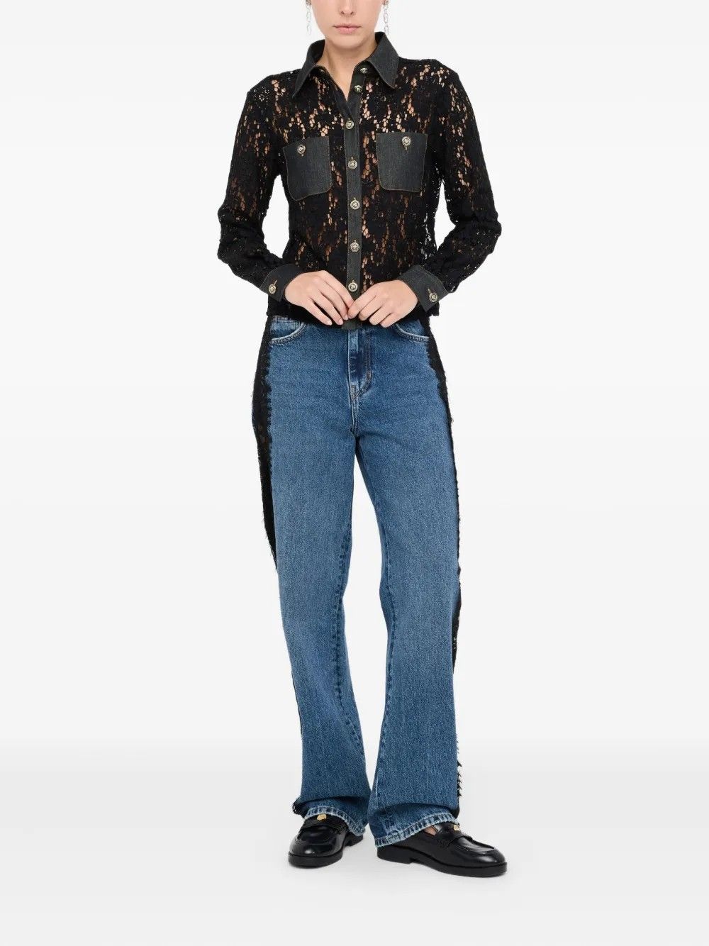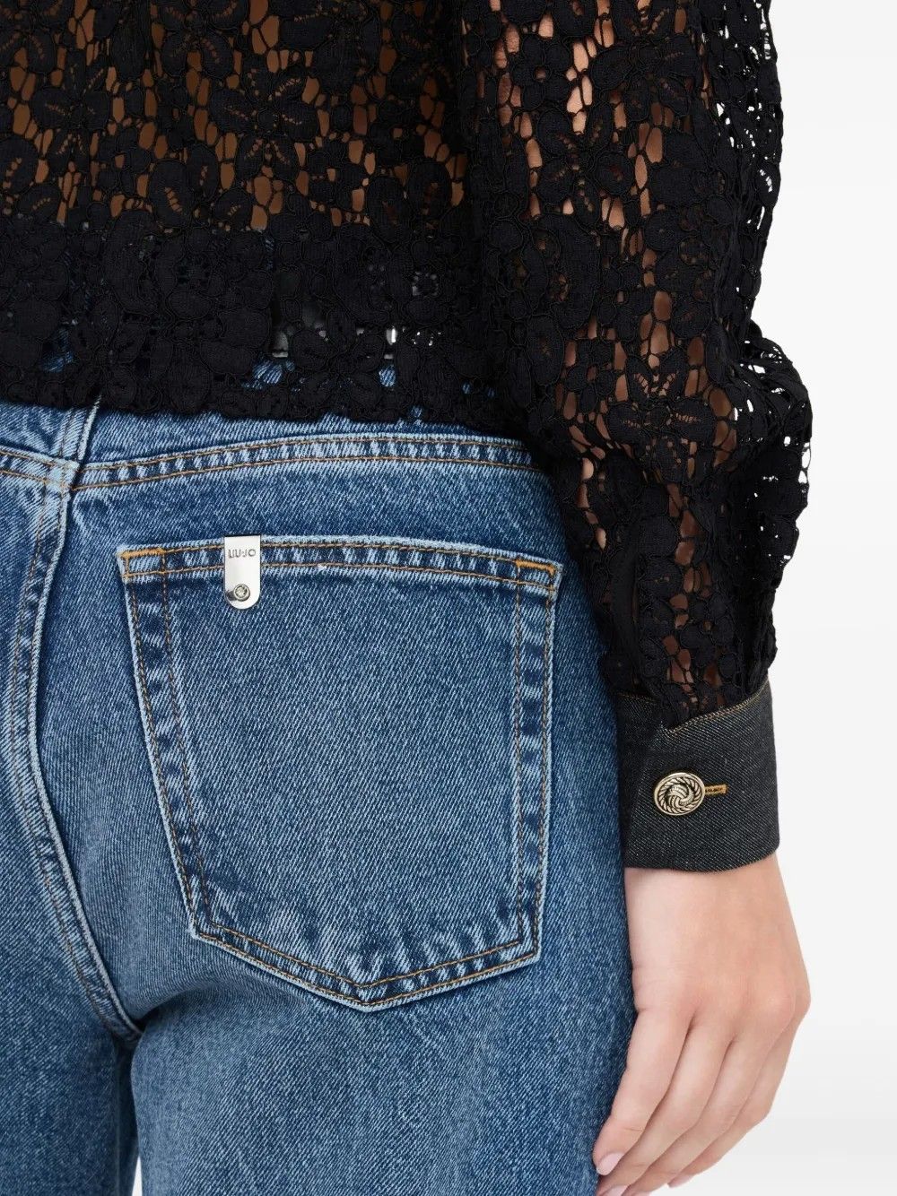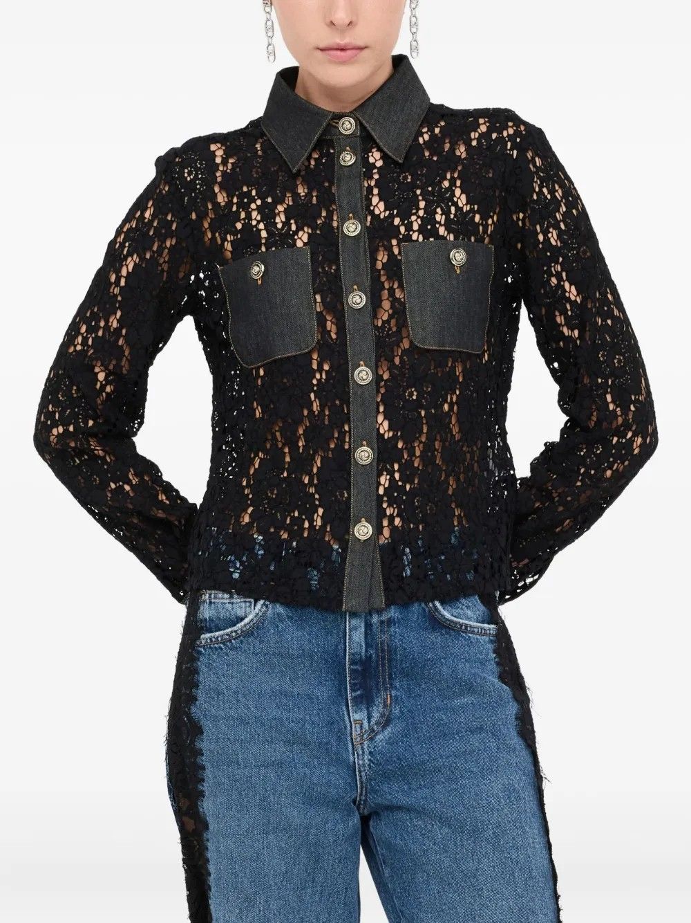 Camicia in pizzo con dettagli in denim che uniscono romanticismo e carattere.Il colletto classico e i taschini con bottone aggiungono un tocco utility.Le maniche lunghe e la chiusura con bottoni completano il design femminile.Il logo in metallo sul retro firma il capo con eleganza.Un mix originale perfetto per look casual chic.