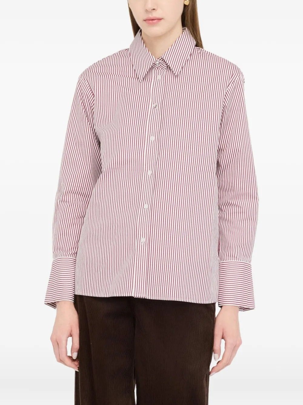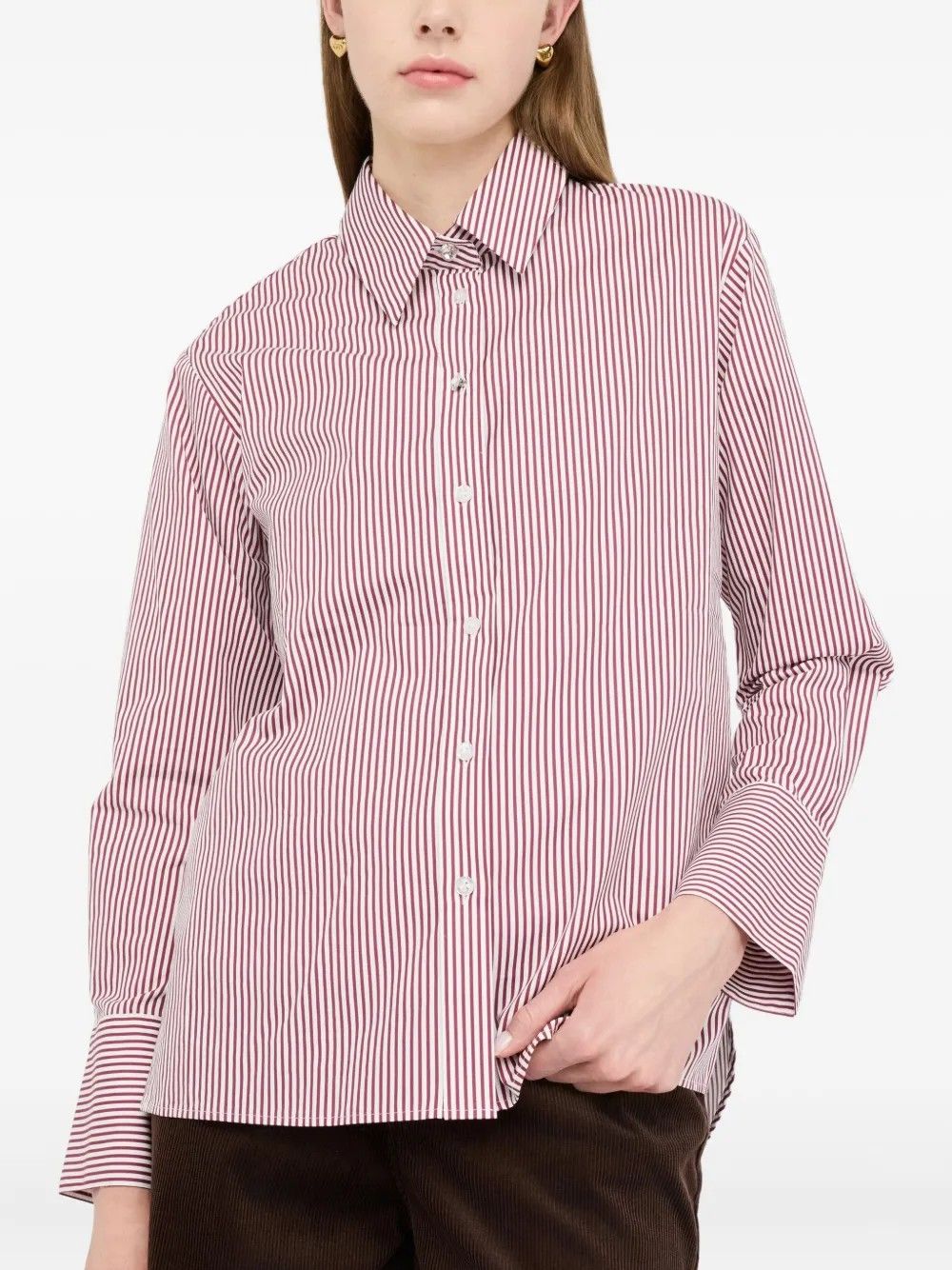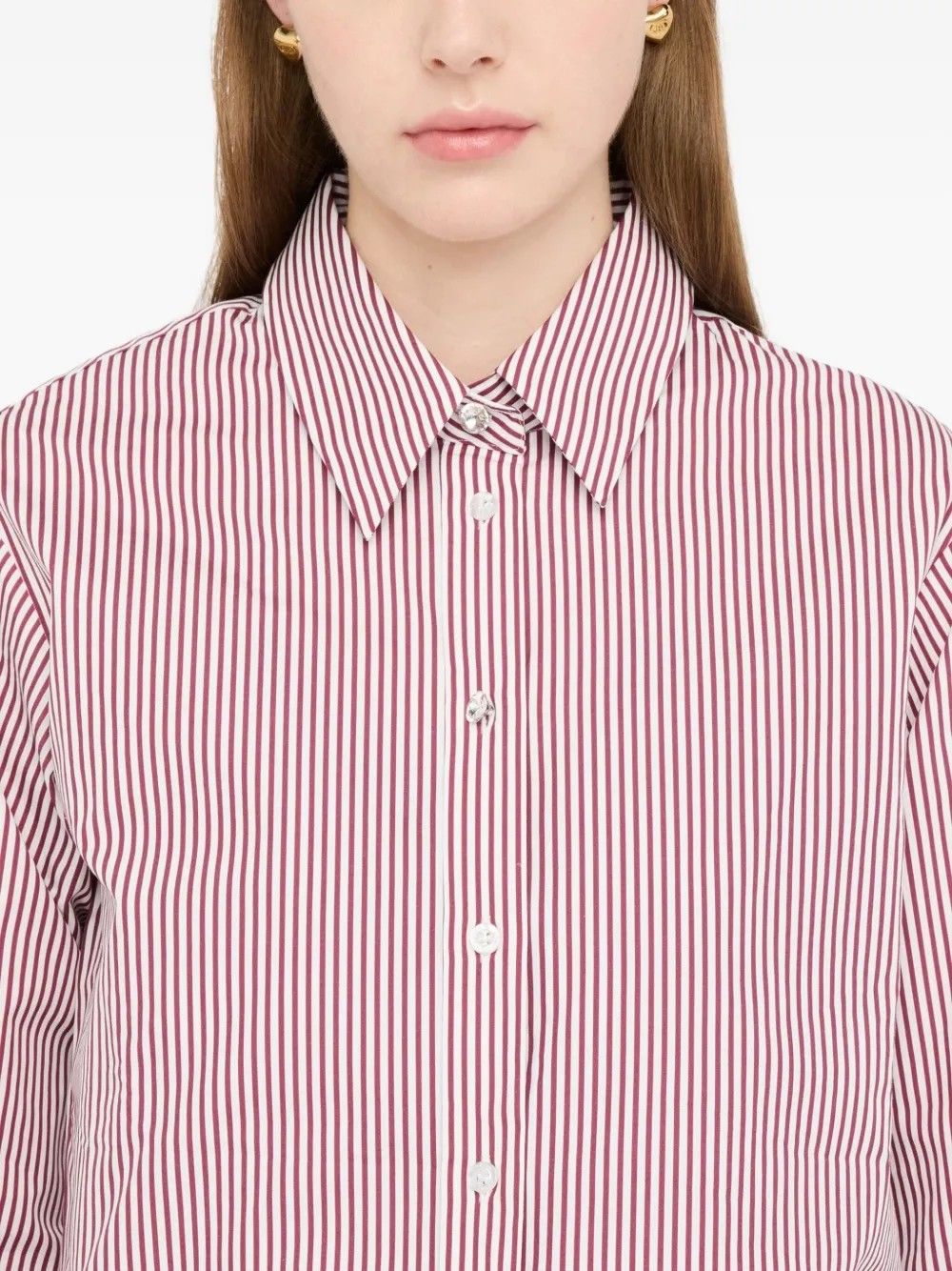 Camicia in popeline di cotone con motivo a righe all over e colletto classico.Maniche lunghe e polsi con bottone per una linea pulita e raffinata.Chiusura frontale con bottoni e logo in metallo applicato sul retro.Include un top abbinato per un look completo e coordinato.Design versatile perfetto per outfit quotidiani curati.