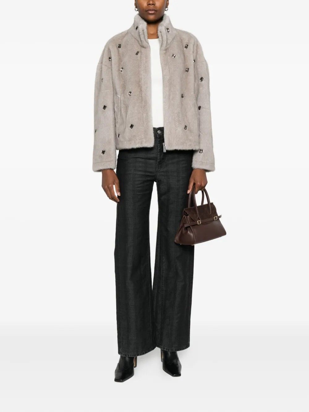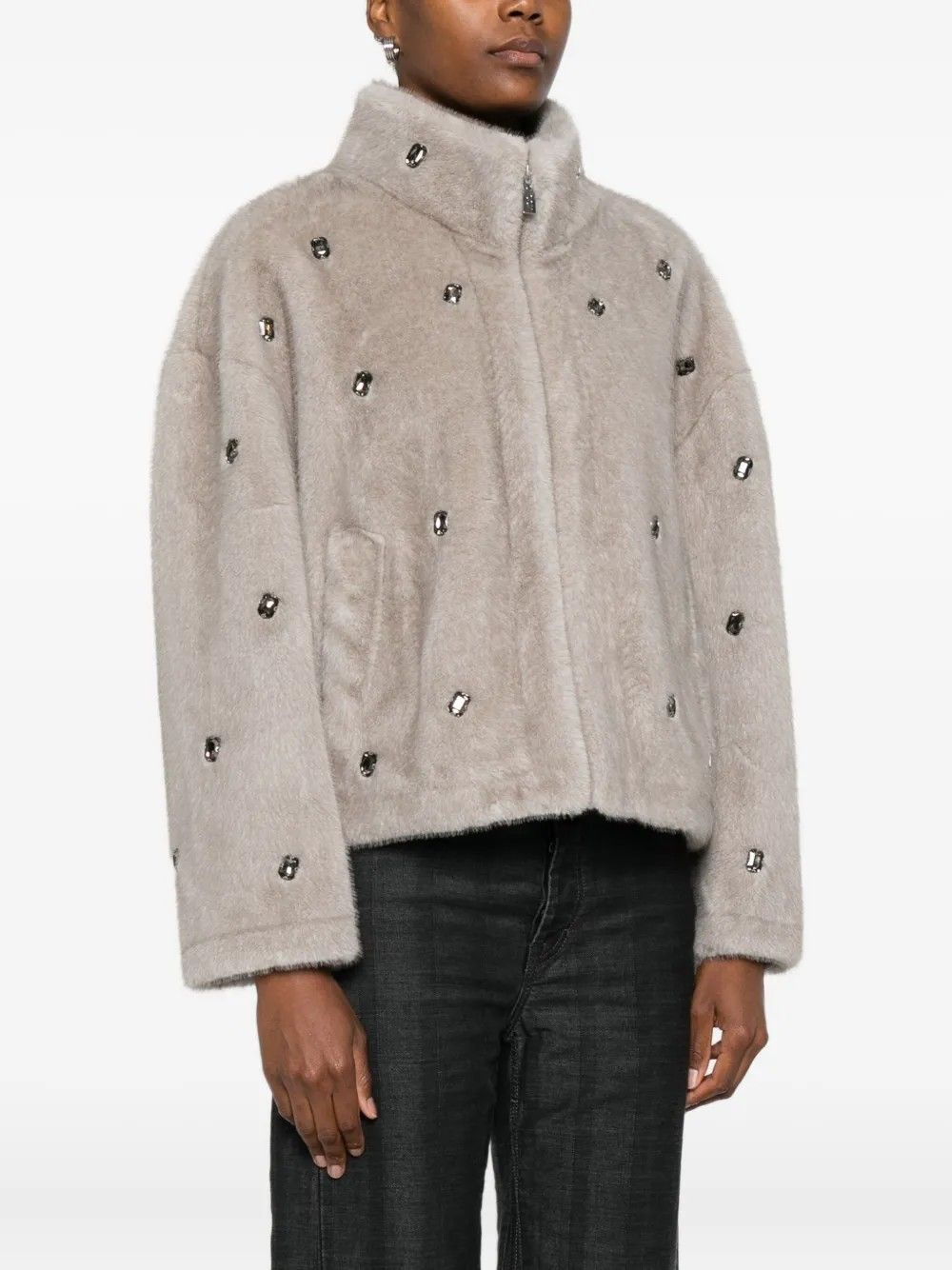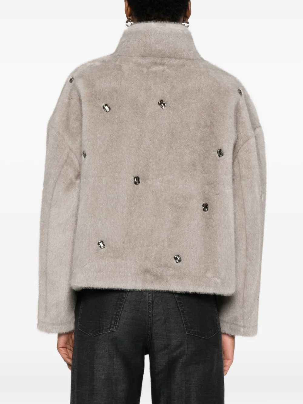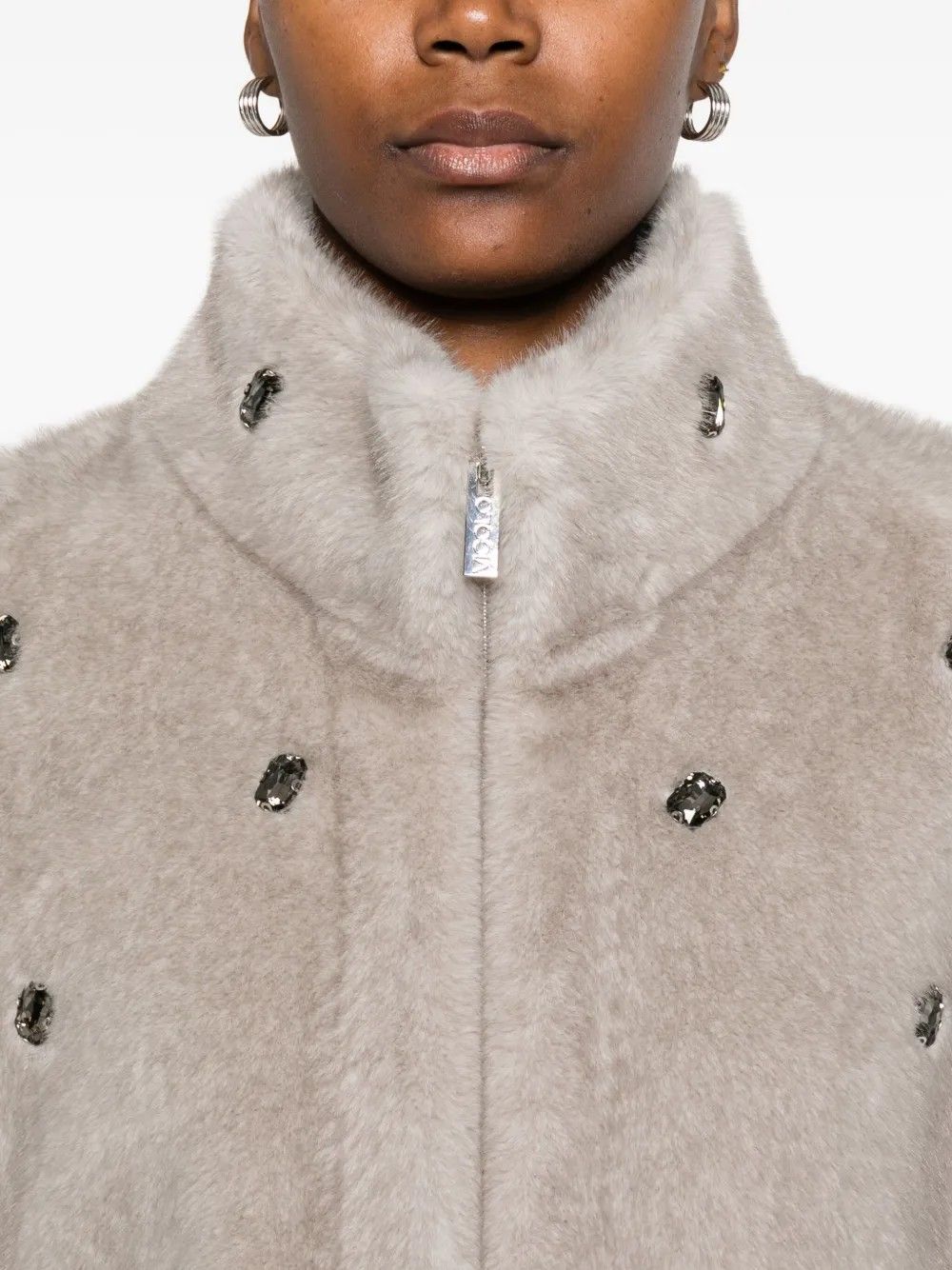 Cappotto dal design moderno impreziosito da una decorazione di strass che aggiunge luminositĂ e femminilitĂ al look.La chiusura frontale con zip e le tasche applicate coniugano praticitĂ e stile.Realizzato in tessuto 100%,offre una vestibilitĂ comoda e avvolgente.Un capo statement perfetto per elevare anche l’outfit piĂ¹ semplice.