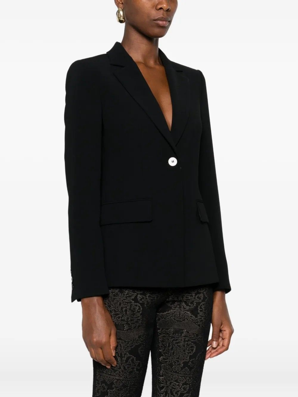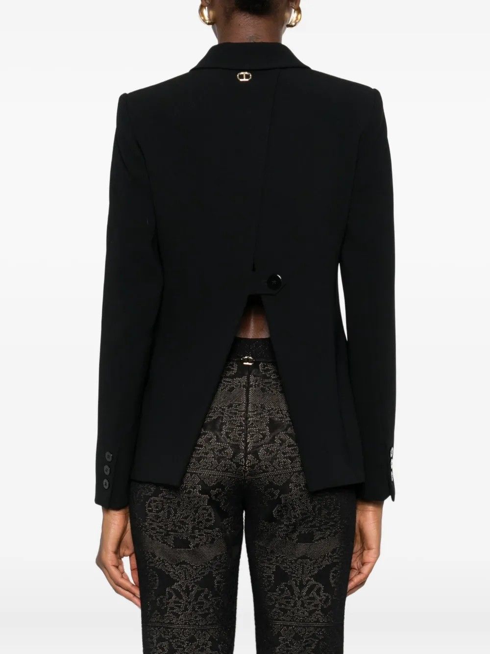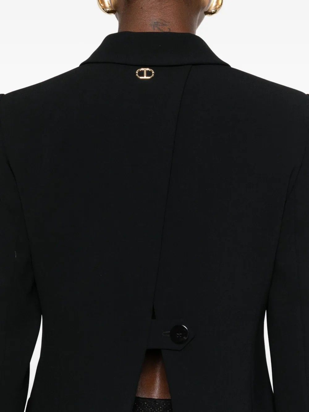 Giacca blazer in crĂªpe con apertura asimmetrica sul retro chiusa da cinturino e bottone.Linea dritta con collo a revers e chiusura monopetto con bottone.Tasche con doppio filetto e patta per dettagli raffinati.Fodera interna per comfort e vestibilitĂ perfetta.Stile moderno e versatile ideale per look eleganti o professionali.Un capo distintivo che unisce funzionalitĂ e design.