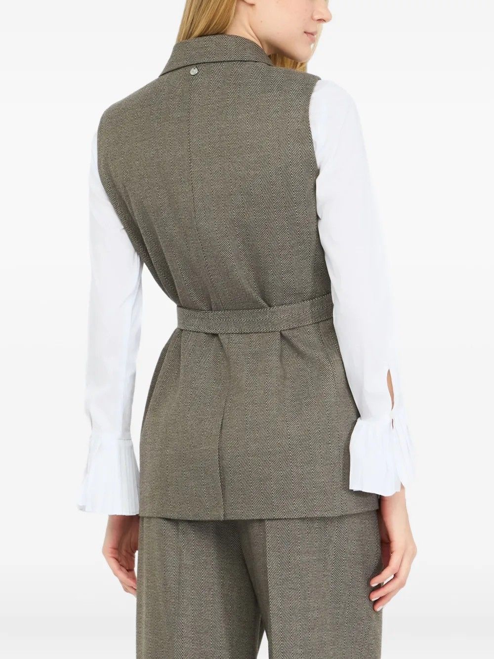 Gilet Liu Jo con motivo chevron e spilla decorativa con pendenti e strass.Design doppiopetto con revers a punta e cintura tono su tono.Apertura posteriore e tasche ad aletta per funzionalità e stile.Realizzato con materiali misti di qualità per comfort e durata.Linea elegante e moderna che completa look sofisticati e contemporanei.Accessorio versatile dal carattere distintivo.