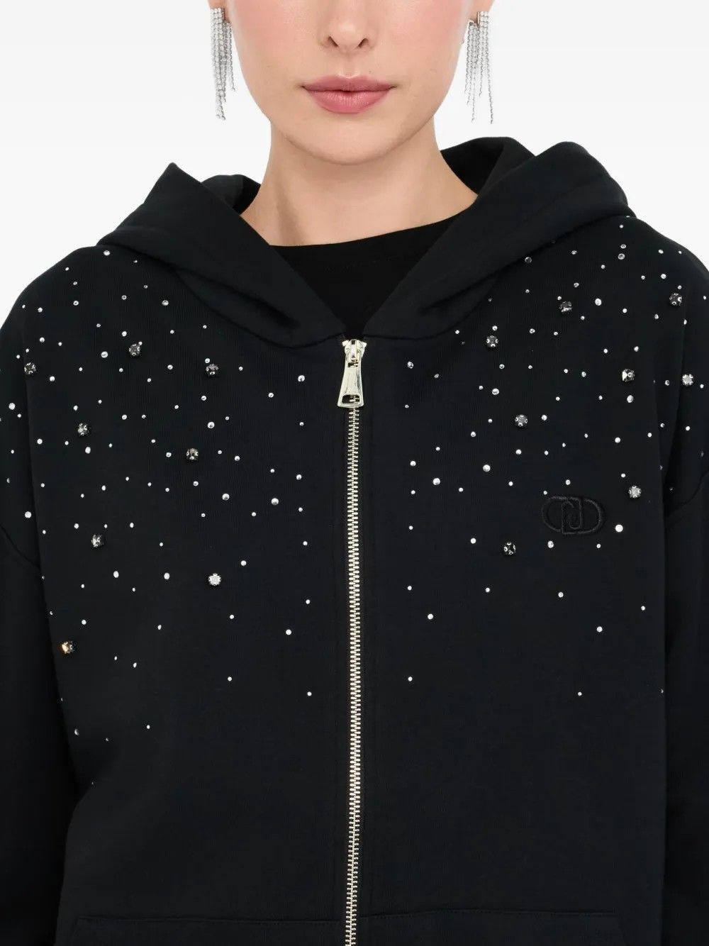 Felpa con cappuccio Liu Jo Denim arricchita da brillanti applicazioni di strass sulla parte superiore.Chiusura con zip a tutta lunghezza e cappuccio regolabile con coulisse.Tasca a marsupio pratica e polsini con bordo a costine per una vestibilità confortevole.Maniche lunghe e design versatile per un look casual ma raffinato.Un capo perfetto per aggiungere un tocco di eleganza al quotidiano.