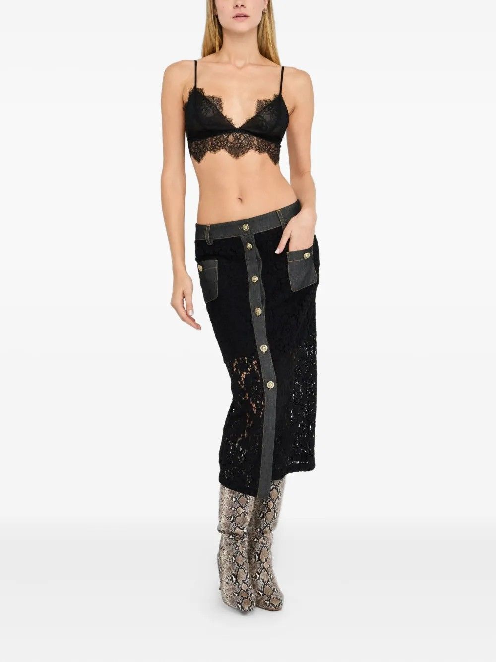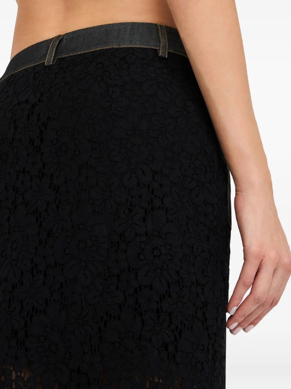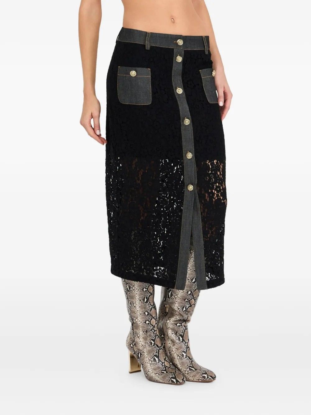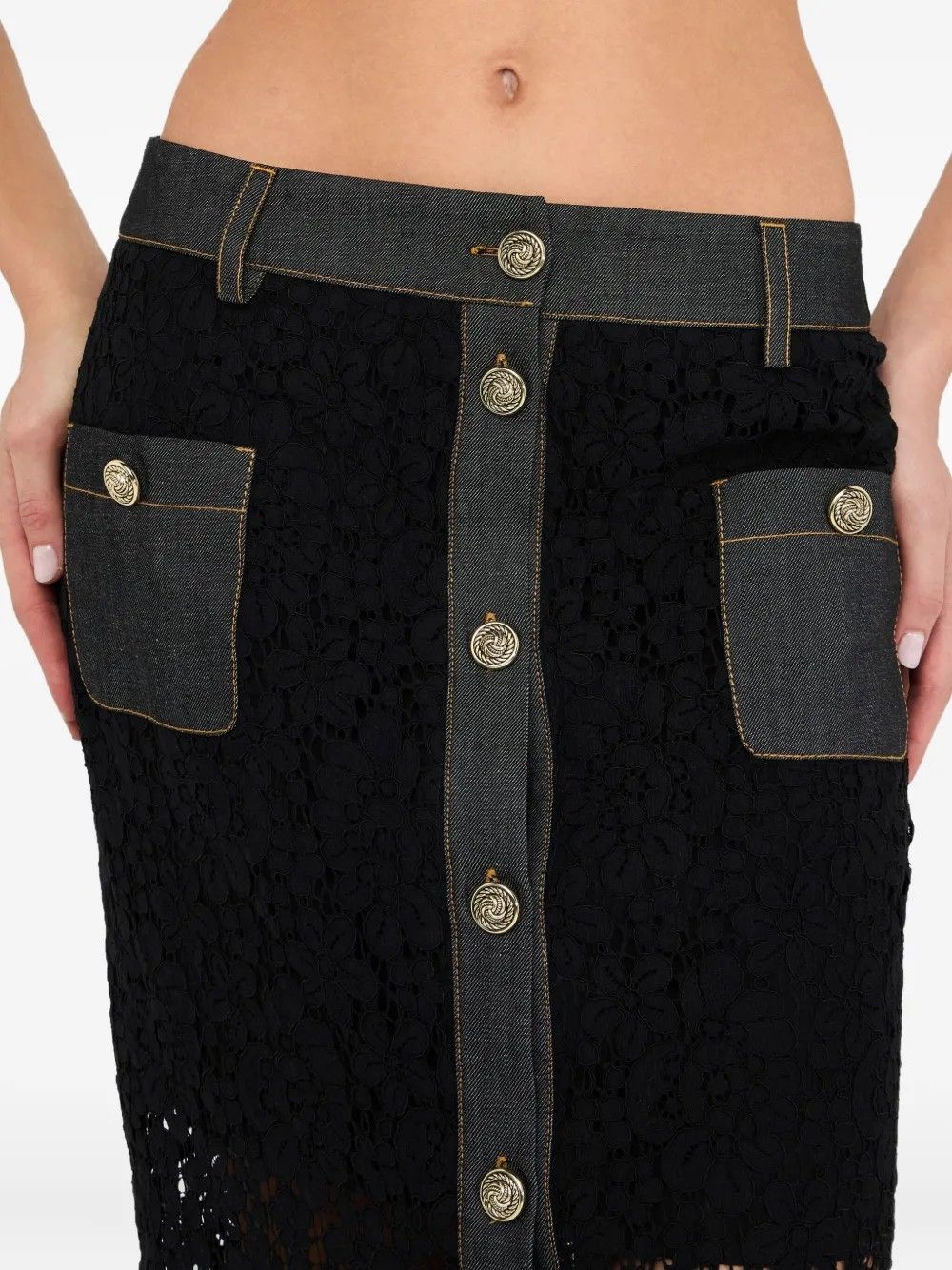 Gonna longuette in pizzo con dettagli in denim, arricchita da tasche con bottone e chiusura frontale con bottoni.La fodera interna garantisce comfort e vestibilità perfetta.Un capo elegante e originale, ideale per look sofisticati e di carattere.Design raffinato che unisce tradizione e modernità .