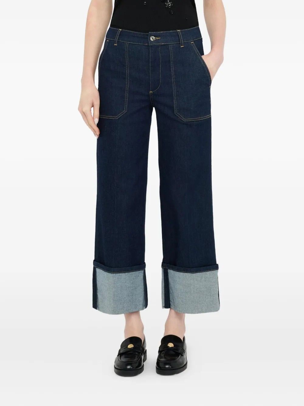 Jeans cropped in denim stretch dal lavaggio blu scuro con vita bassa e gamba dritta.Il modello cinque tasche presenta salpa logata e logo LJ ricamato sul retro.Il risvolto al fondo aggiunge un tocco casual e contemporaneo.Chiusura con bottone e zip coperta per una finitura pulita.Realizzati in cotone elasticizzato per comfort e vestibilità ottimale.Fa parte della linea Liu Jo Better,attenta a stile e sostenibilità .