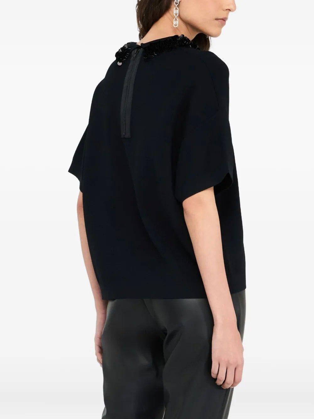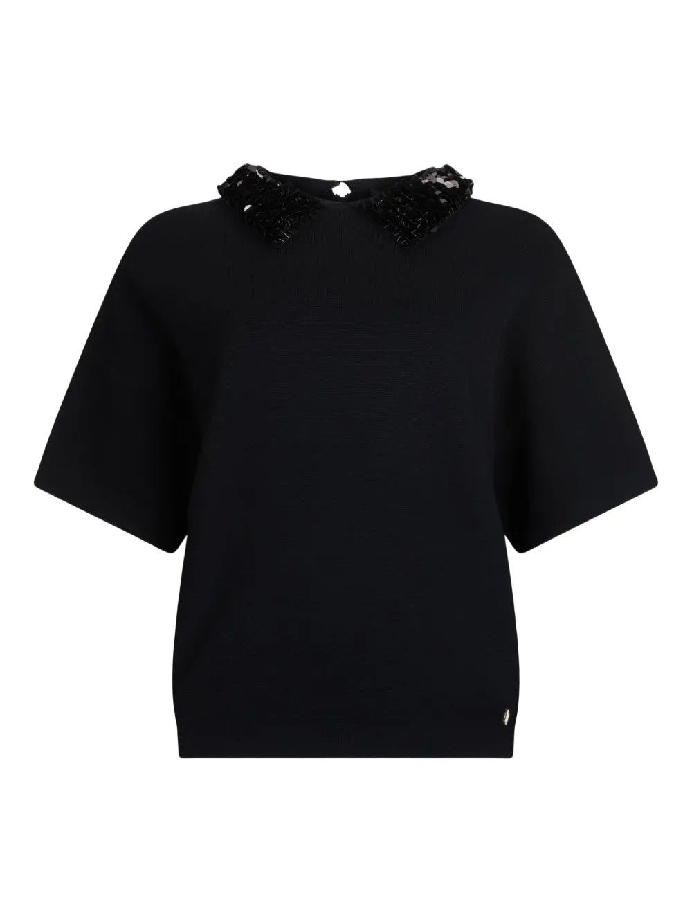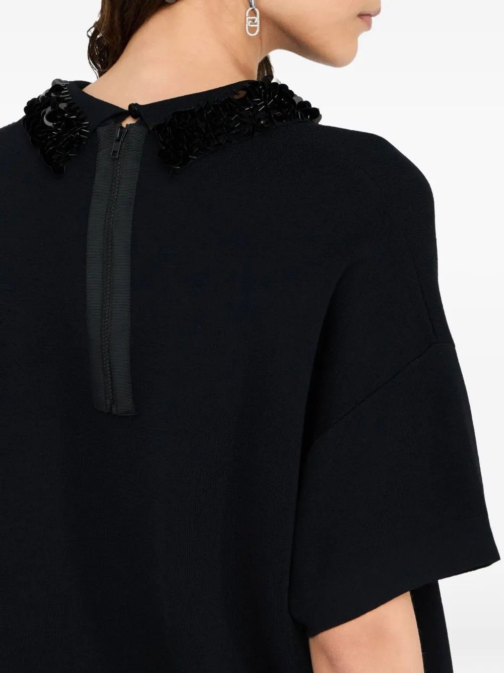Maglia con collo a camicia arricchito da paillettes circolari per un effetto brillante e raffinato.Vestibilità over che dona un tocco moderno e rilassato alla silhouette.Maniche corte e tessuto confortevole per uno stile casual chic ideale ogni giorno.Cerniera visibile sul retro che aggiunge carattere e originalità al design.Perfetta da abbinare a pantaloni o gonne per un look versatile e femminile.Dettagli curati per esprimere personalità con eleganza.
