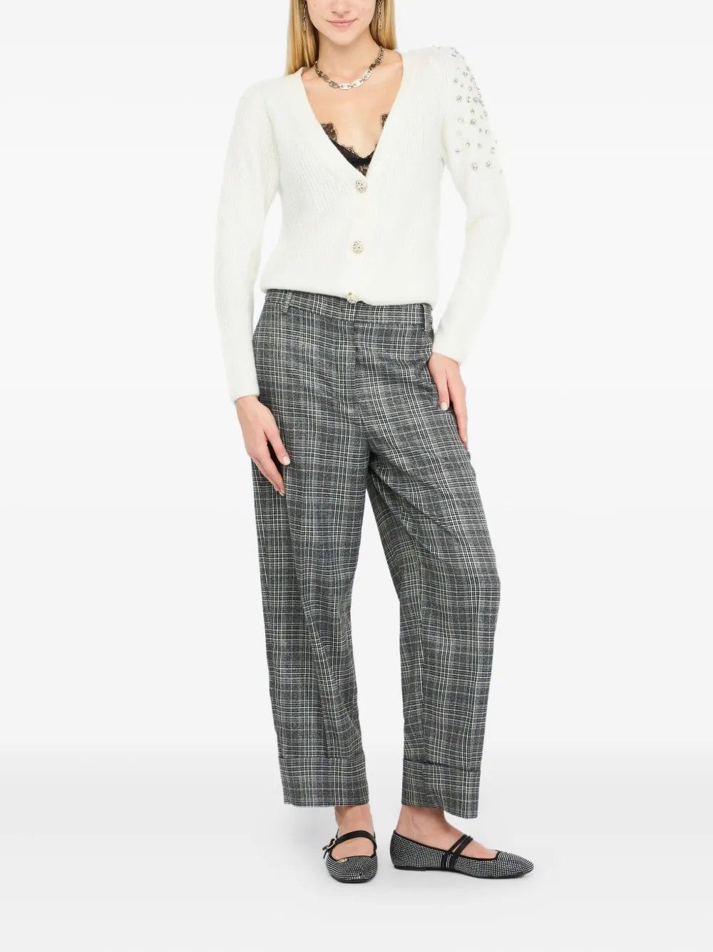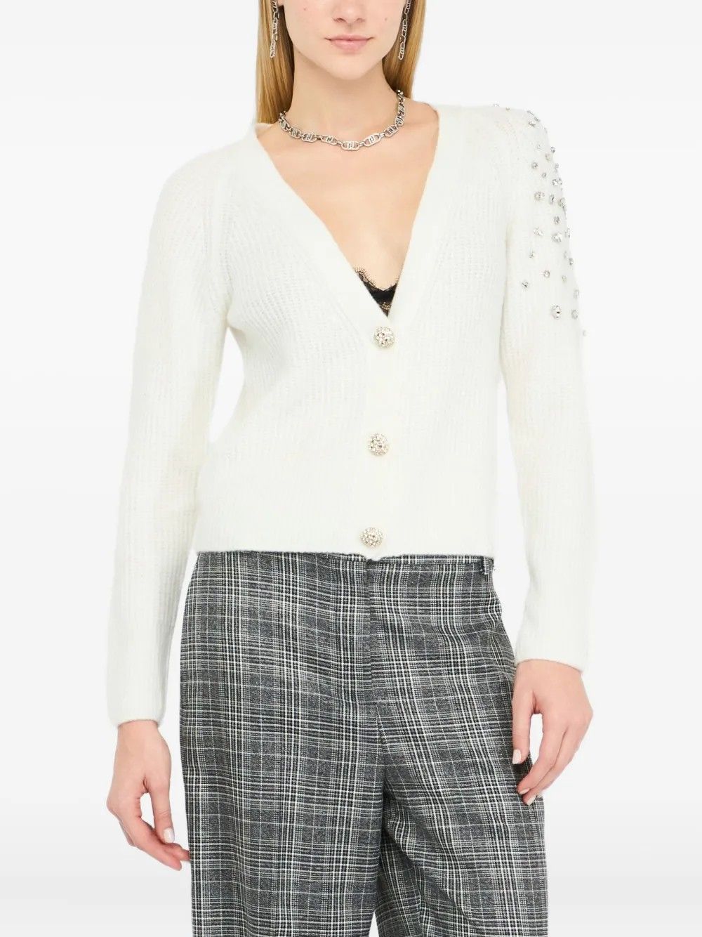 Cardigan crop Liu Jo con chiusura frontale a bottoni e scollo a V elegante. Arricchito da dettagli in strass che donano un tocco luminoso e raffinato.Composizione mista di nylon, lana, acrilico ed elastam per comfort e vestibilità perfetta.Un capo versatile ideale per look chic e contemporanei, perfetto per arricchire ogni outfit con stile.