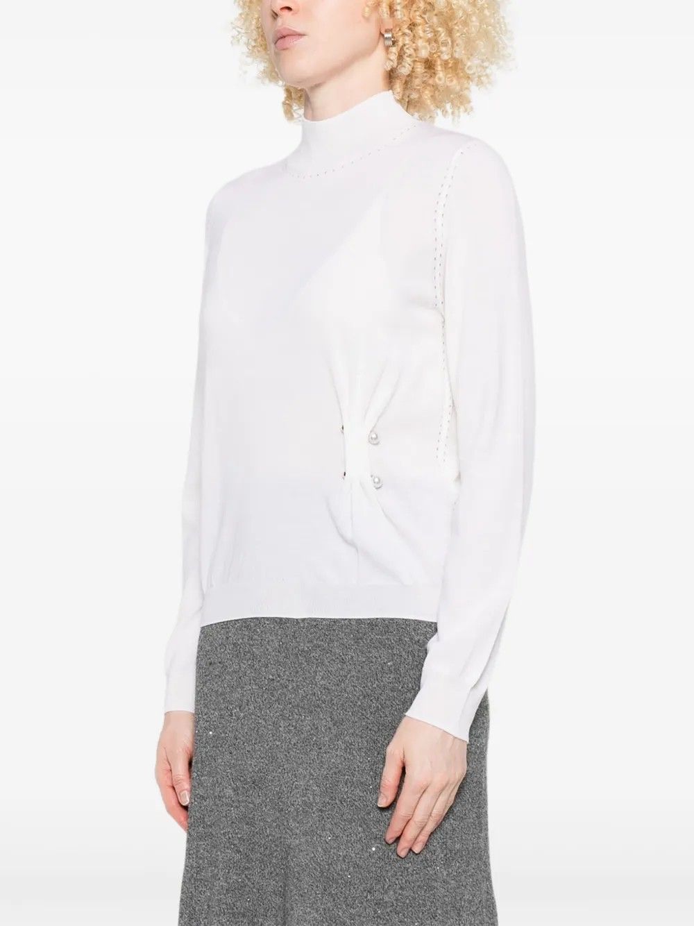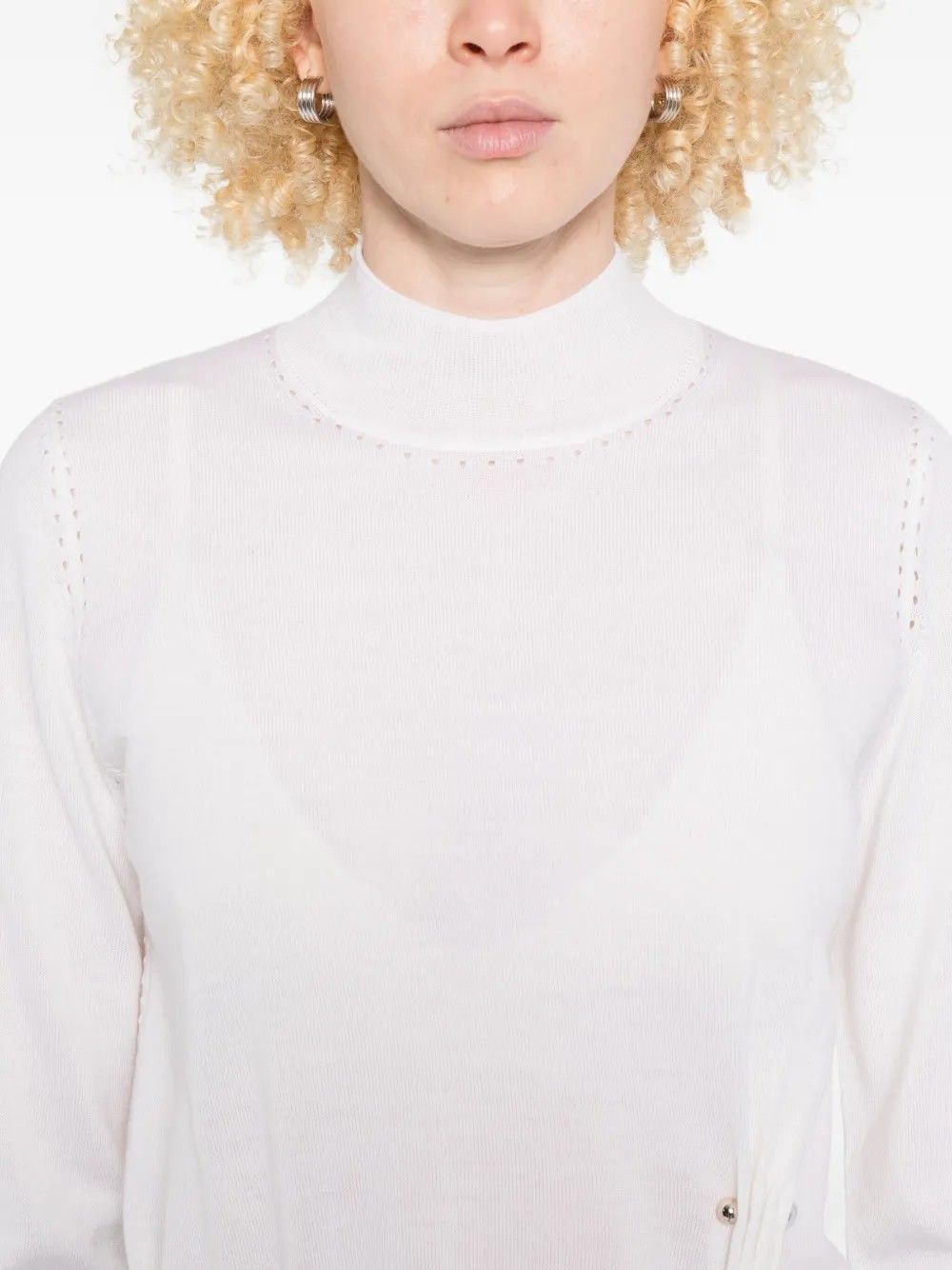 Maglia Liu Jo realizzata in lana con motivo arricciato impreziosito da perle.Il collo alto e le maniche lunghe assicurano calore e comfort.I bordi a costine completano un design raffinato e femminile.Un capo versatile perfetto per look eleganti e quotidiani.Realizzata con materiali di alta qualità per durabilità e stile.Classico e contemporaneo si incontrano in questo modello.