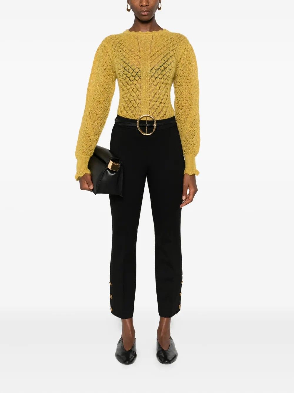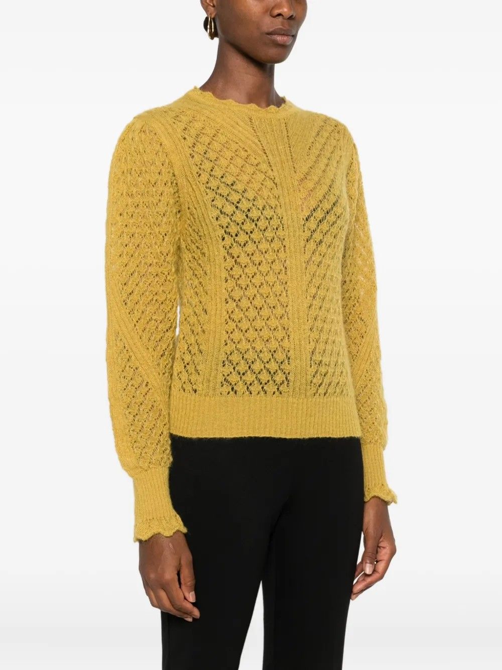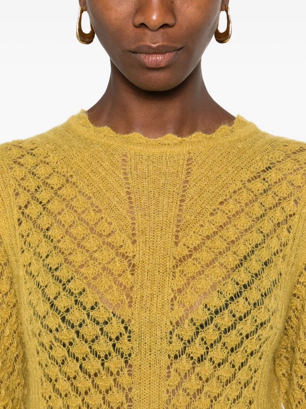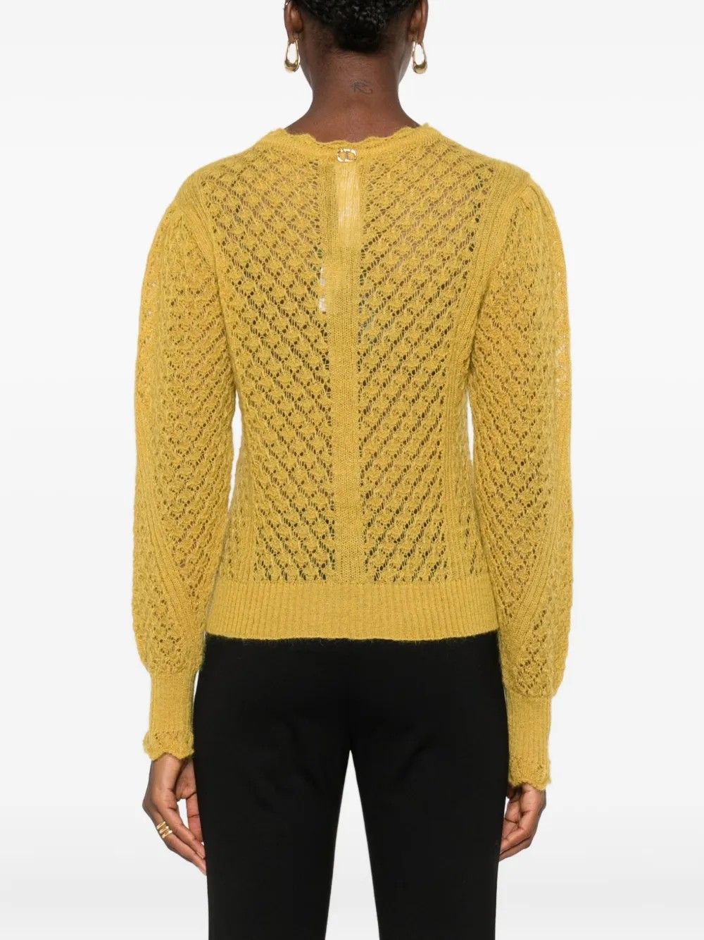 Maglione Twinset con motivo geometrico e girocollo dal taglio classico.Maniche lunghe e polsini rifiniti con ruches per un tocco femminile.Realizzato in una miscela calda di mohair, lana e poliammide.Design elegante e originale perfetto per look quotidiani e raffinati.Linea morbida e confortevole che unisce stile e praticitĂ .