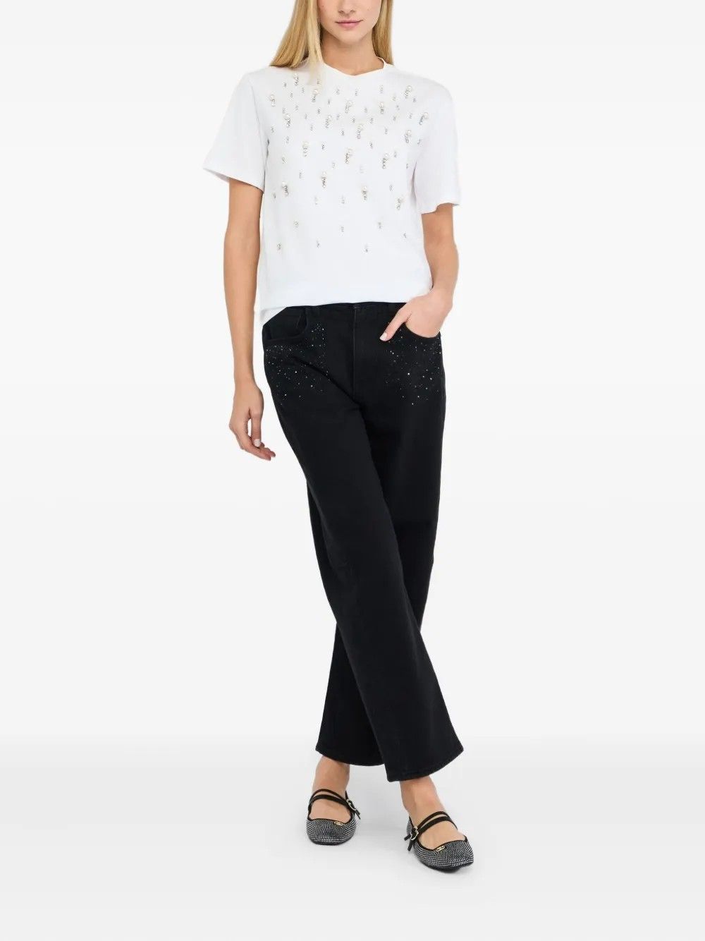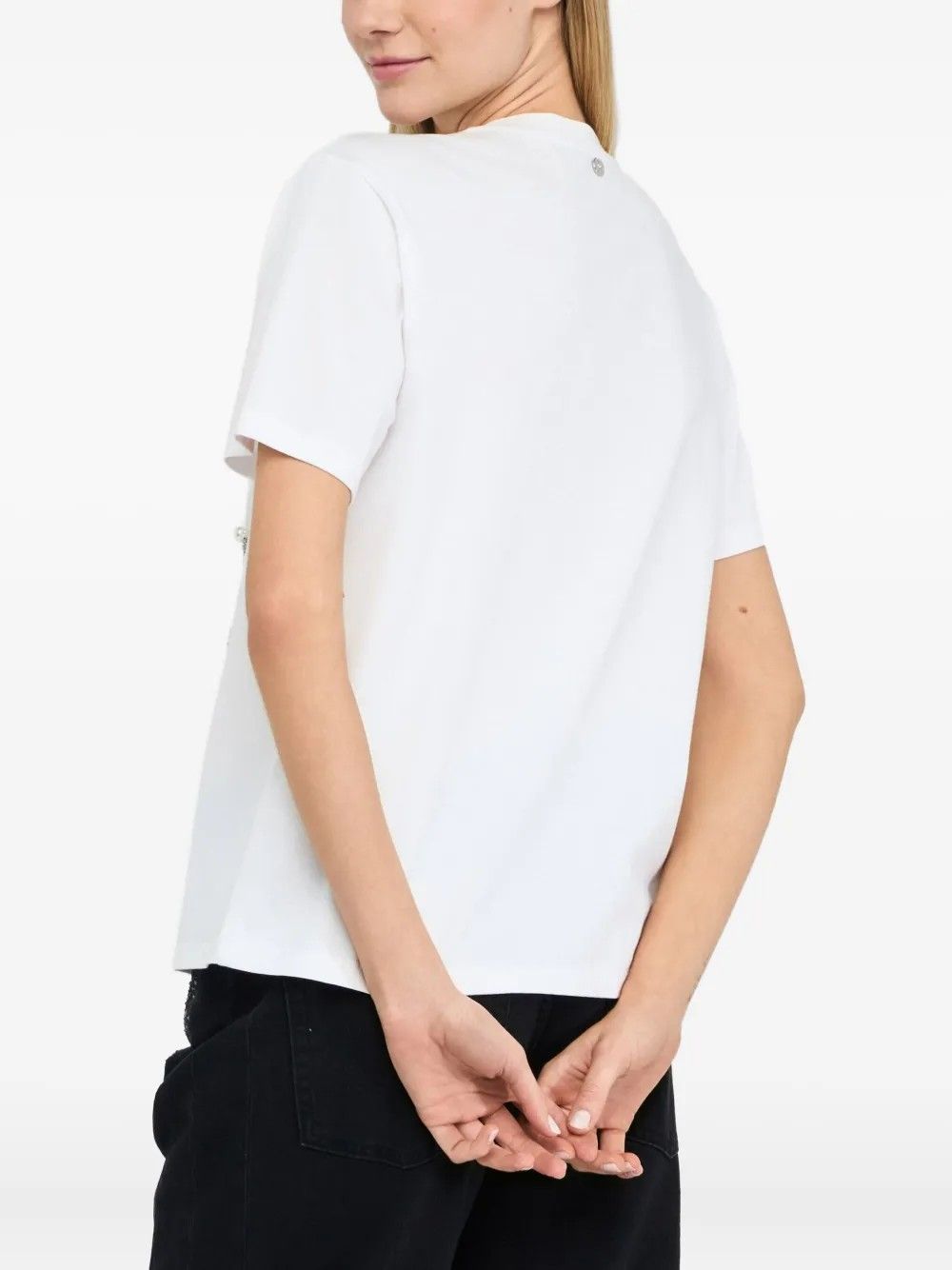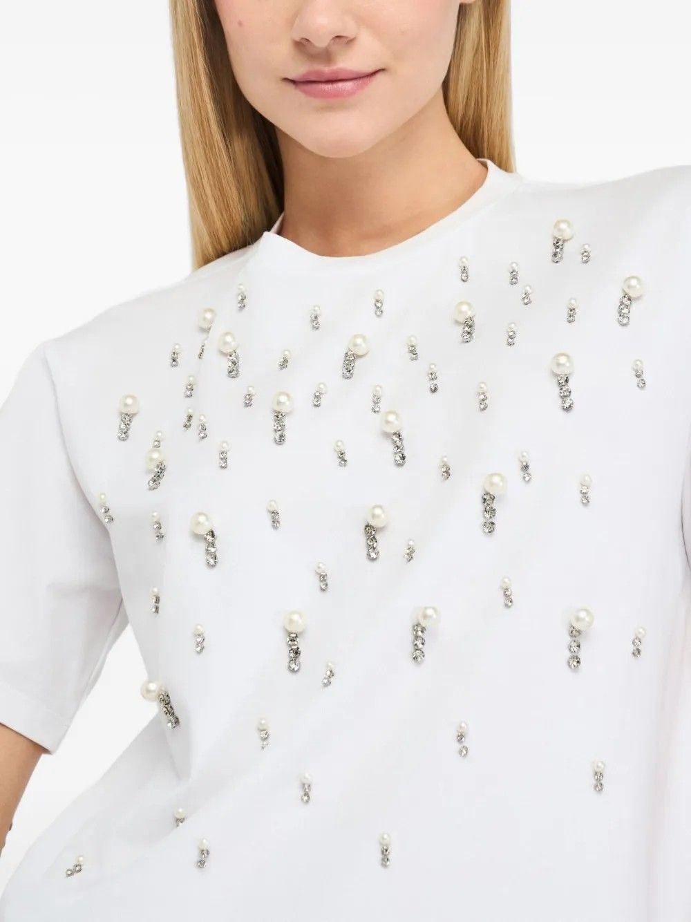T-shirt in jersey stretch con design a tinta unita e taglio girocollo per un look semplice e raffinato.Perle e strass applicati sul collo aggiungono un tocco luminoso ed elegante.Maniche corte e vestibilità regular ideali per un uso versatile durante tutto l’anno.Logo in metallo sul retro che arricchisce il capo con un dettaglio distintivo.Realizzata in cotone ed elastan per comfort e morbidezza a contatto con la pelle.Perfetta per chi desidera uno stile femminile con un tocco glamour.
