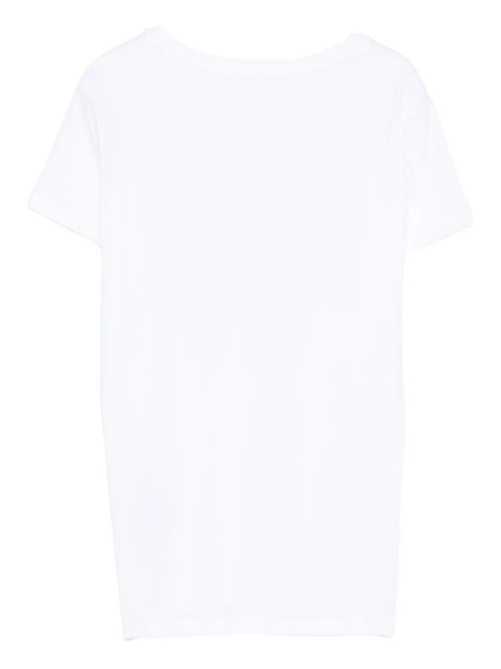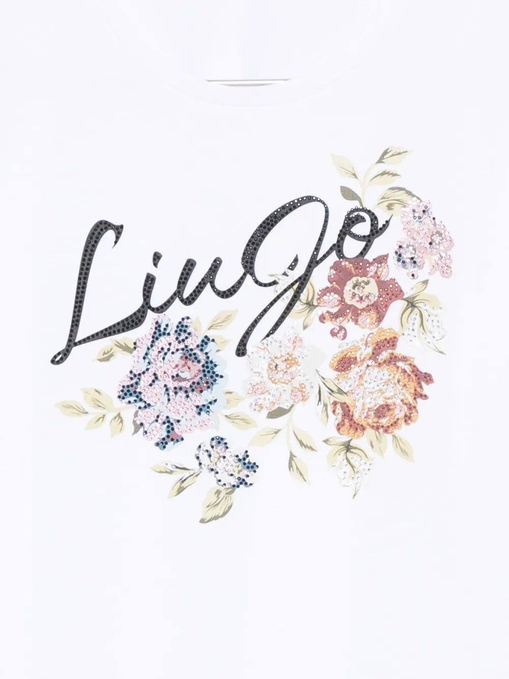 La t-shirt Liu Jo in cotone 100% bianco è caratterizzata da una stampa a fiori e un logo distintivo sul davanti.Le maniche corte e il girocollo assicurano una vestibilità comoda e casual, ideale per completare look freschi e moderni.