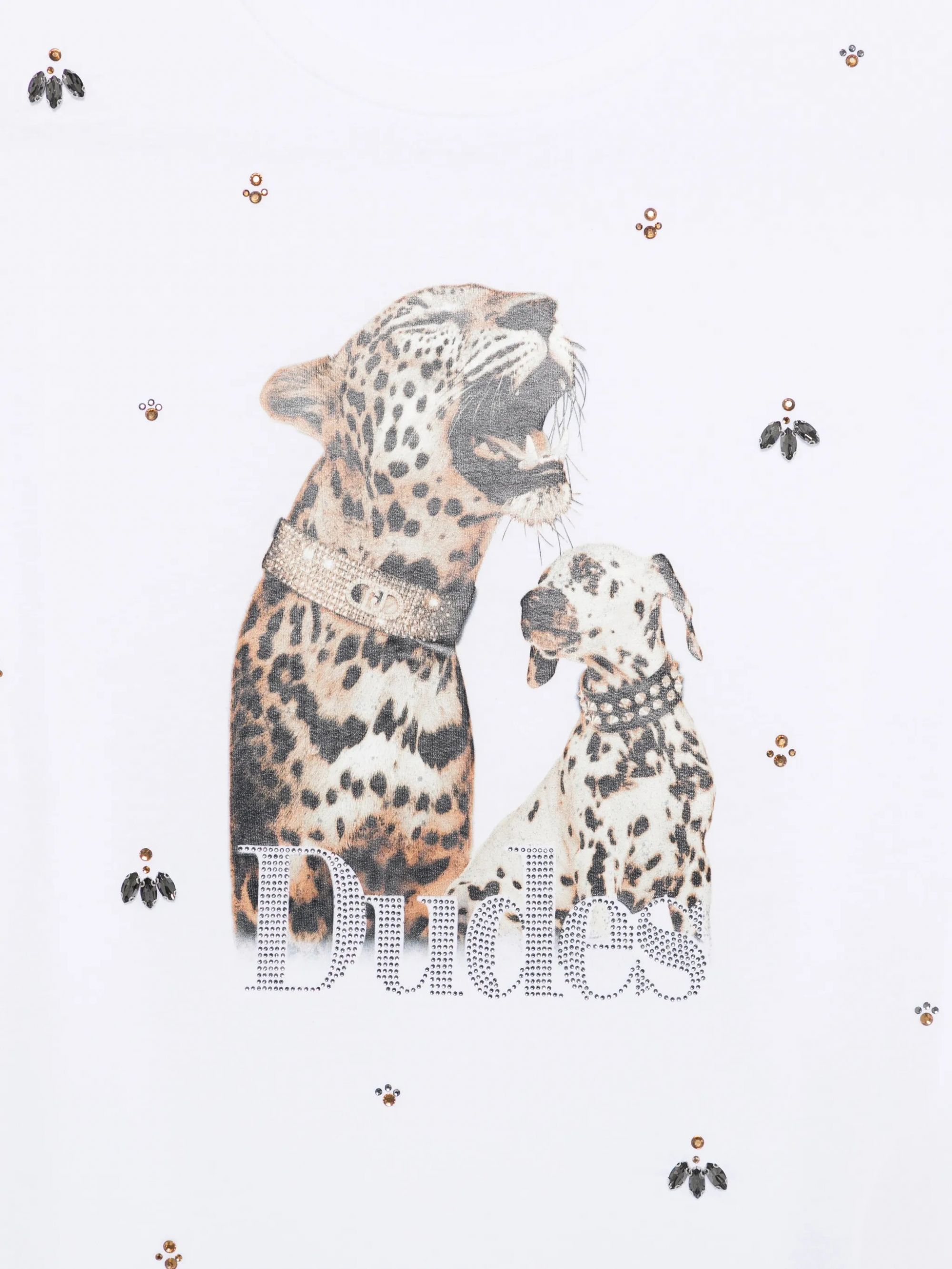 Scopri la T-shirt di LIU JO, un capo unico con una stampa accattivante di un leopardo e un dalmata abbellita dalla scritta "Dudes" in strass. Arricchita da dettagli scintillanti, questa maglietta offre un tocco di originalità al tuo guardaroba. Perfetta per chi vuole aggiungere un tocco di creatività al proprio look quotidiano.
