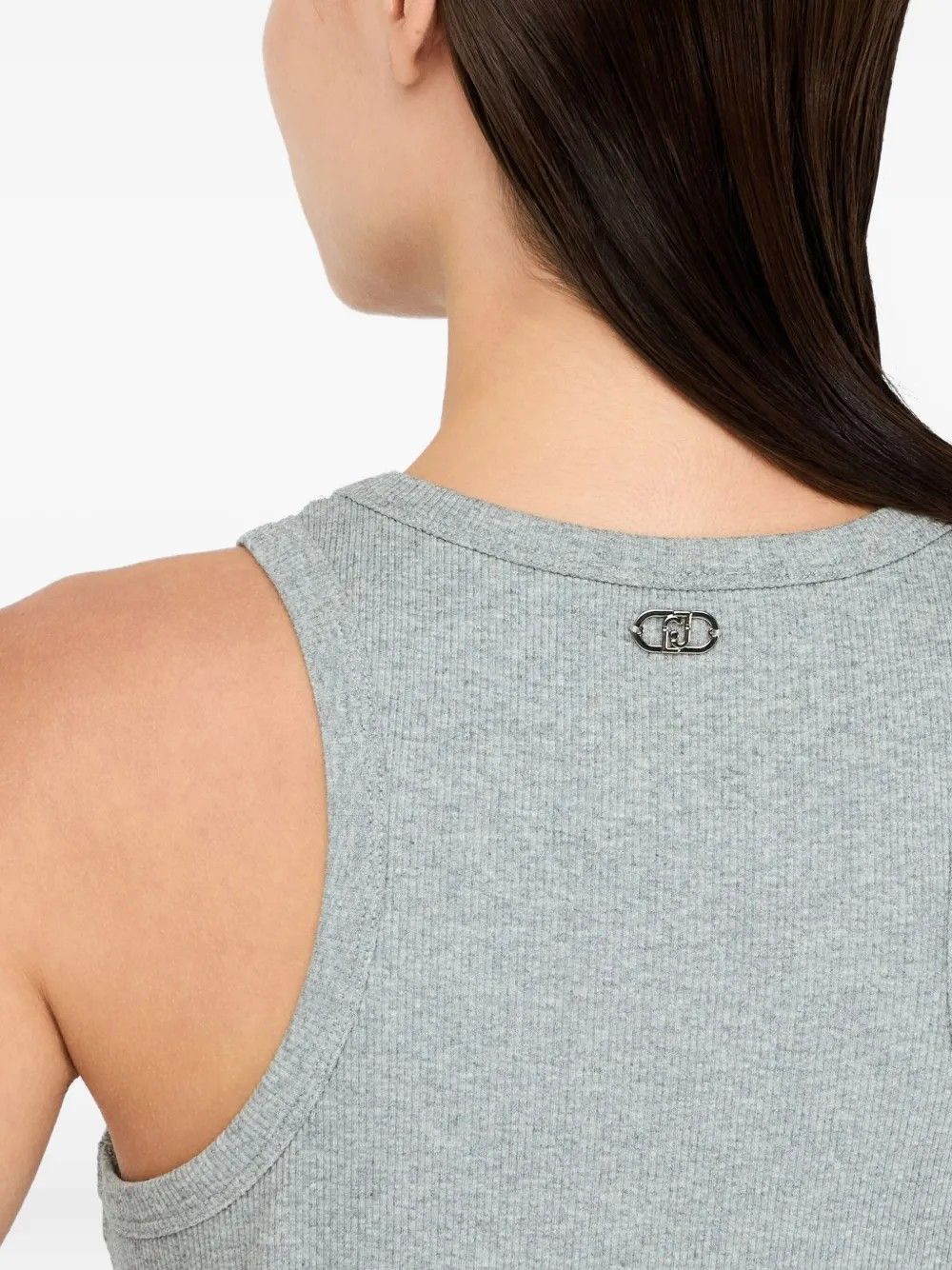 Top Liu Jo in cotone stretch a coste con scollo vogatore.Ricami gioiello sul davanti per un tocco luminoso e femminile.Vestibilità aderente ideale per look casual chic o stratificati.