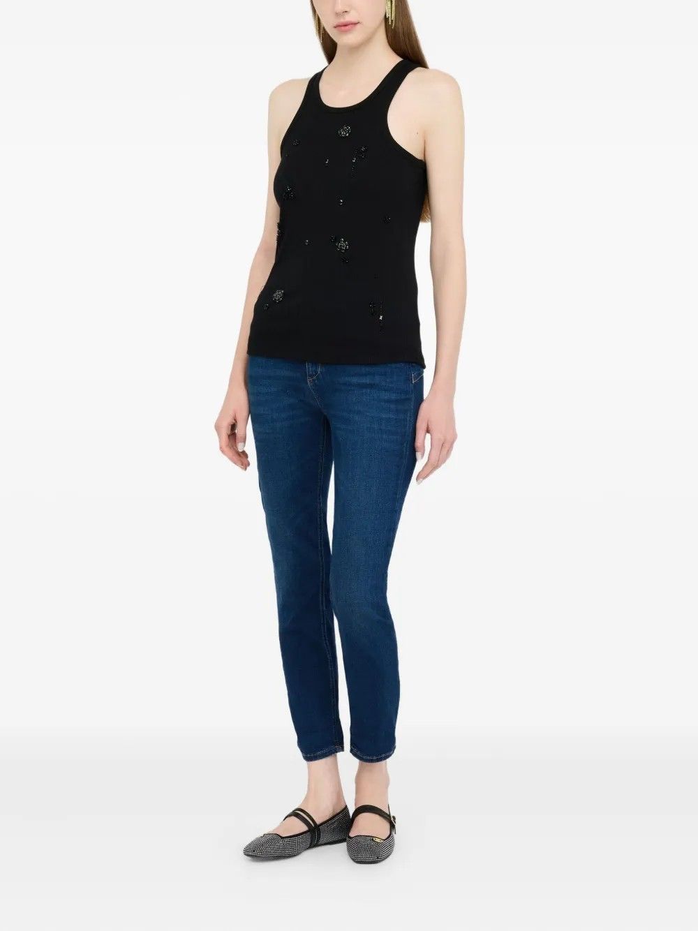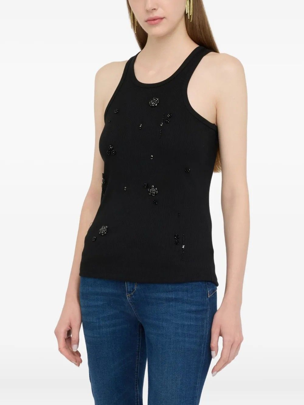 La canotta Liu Jo in cotone 100% si distingue per lo scollo olimpionico e la raffinata decorazione con perline che arricchisce il design.Classica e versatile, unisce comfort e stile per un look elegante e moderno, ideale per diverse occasioni.