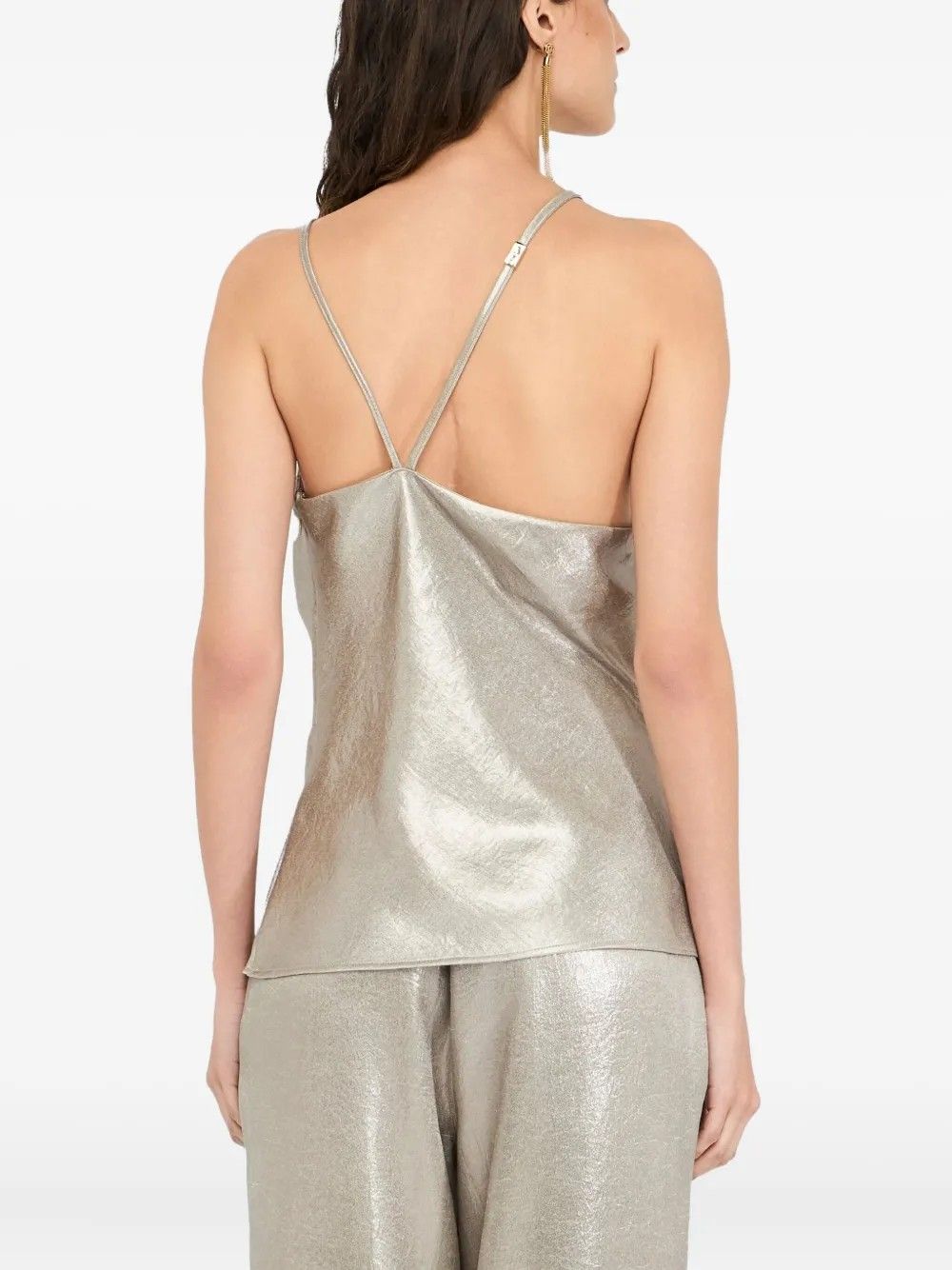 Top Liu Jo in crêpe con effetto lamé e design pull on.Spalline sottili e scollo drappeggiato per un tocco di eleganza raffinata.Realizzato in poliestere di alta qualità per comfort e vestibilità .Leggero e versatile, perfetto per look sofisticati e serali.Accessorio che unisce stile luminoso e femminilità discreta.