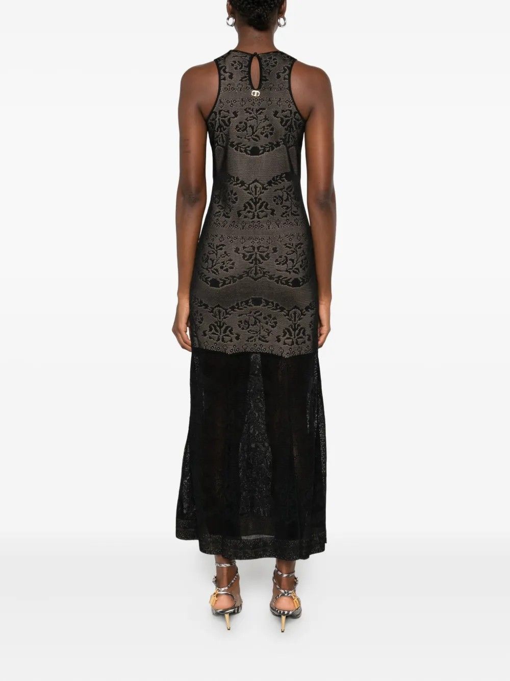 Abito lungo in maglia di viscosa con lavorazione double bicolore e punzonature trasparenti che valorizzano il disegno.Collo tondo con apertura a goccia e bottone sul retro.Linea fitted che esalta la silhouette con gonna ampia per un tocco di eleganza e movimento.Modello raffinato che unisce modernitĂ e stile classico.Perfetto per occasioni speciali o look sofisticati.
