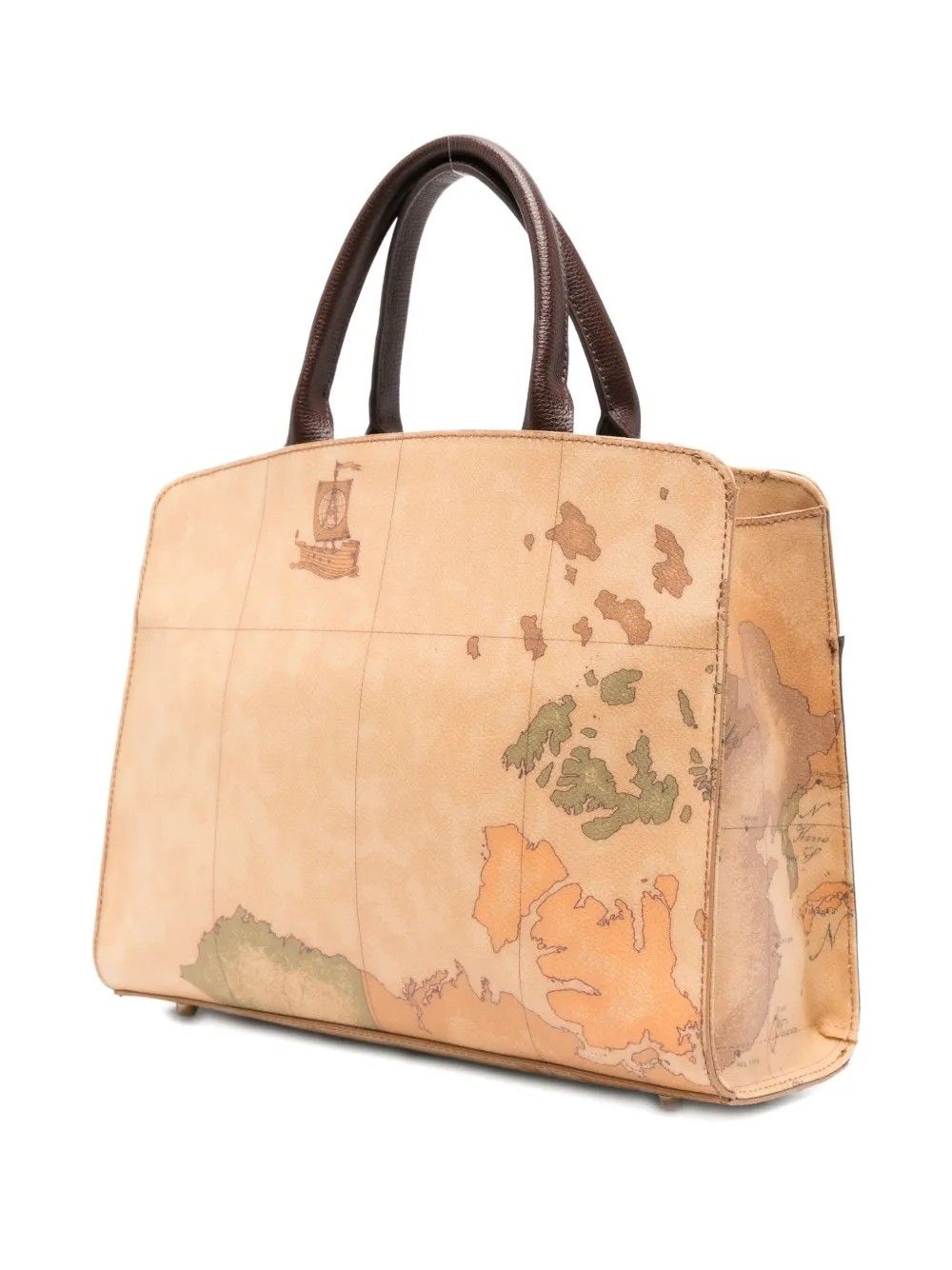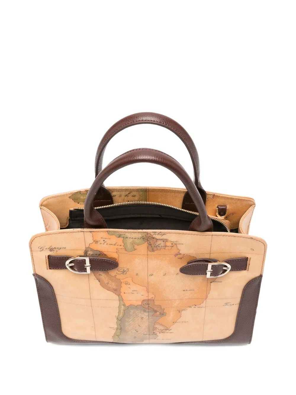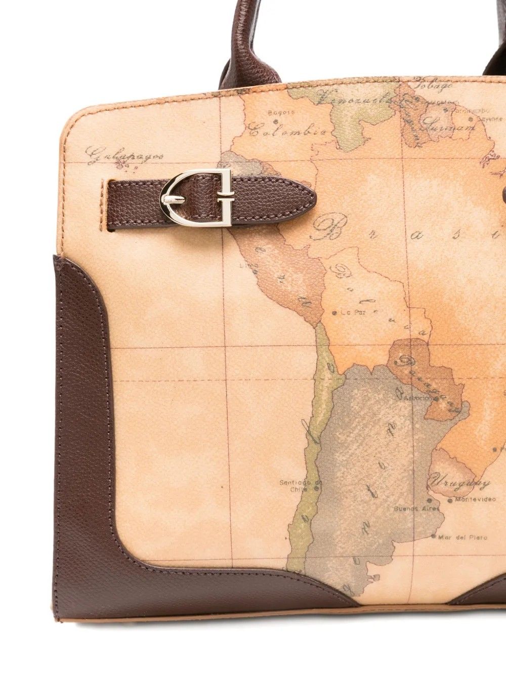 La borsa tote Valley Geo di Alviero Martini 1° Classe unisce design elegante e funzionale con una stampa mappa zodiaco su base marrone.Realizzata in una combinazione di cotone, pelle di vitello, PVC e poliuretano, è dotata di manico resistente e chiusura con fibbia.Misure 30x21x10 cm, perfetta per chi cerca stile e praticità.