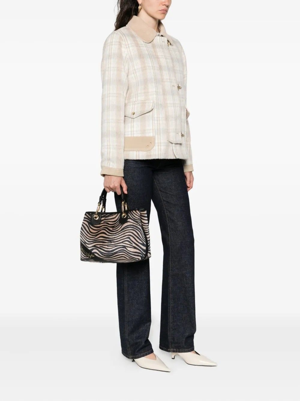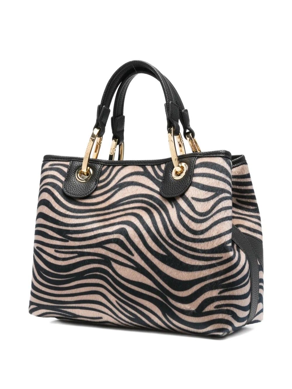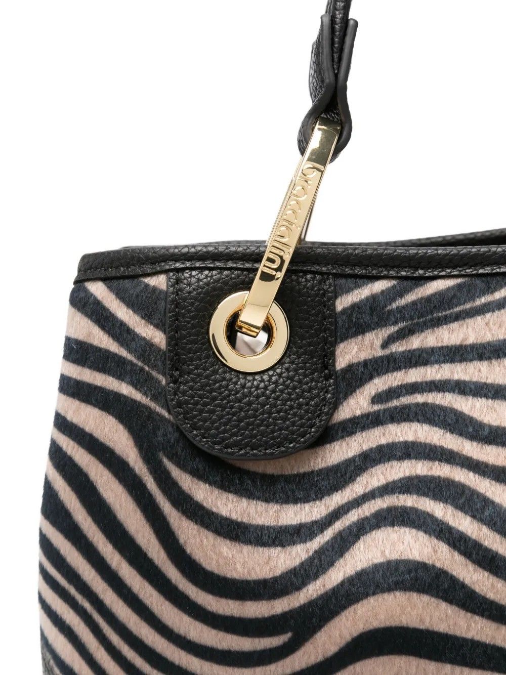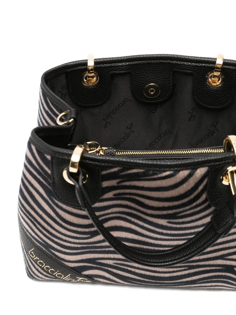 Questa elegante borsa a mano Braccialini aggiunge un tocco distintivo al tuo look grazie alla sua fantasia zebrata. Caratterizzata da un pratico manico doppio e una tracolla rimovibile per versatilità, è ideale per il giorno e la sera.