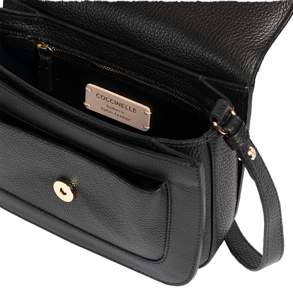 La borsa a tracolla C-Me di Coccinelle si distingue per la pelle in rilievo di alta qualità e il logo color oro che aggiunge un tocco di raffinatezza. Il cinturino regolabile permette una vestibilità personalizzata, mentre la chiusura con patta assicura sicurezza e praticità. Le dimensioni compatte di 21x17x6 cm la rendono perfetta per accompagnarti con stile in ogni occasione, dal giorno alla sera.
