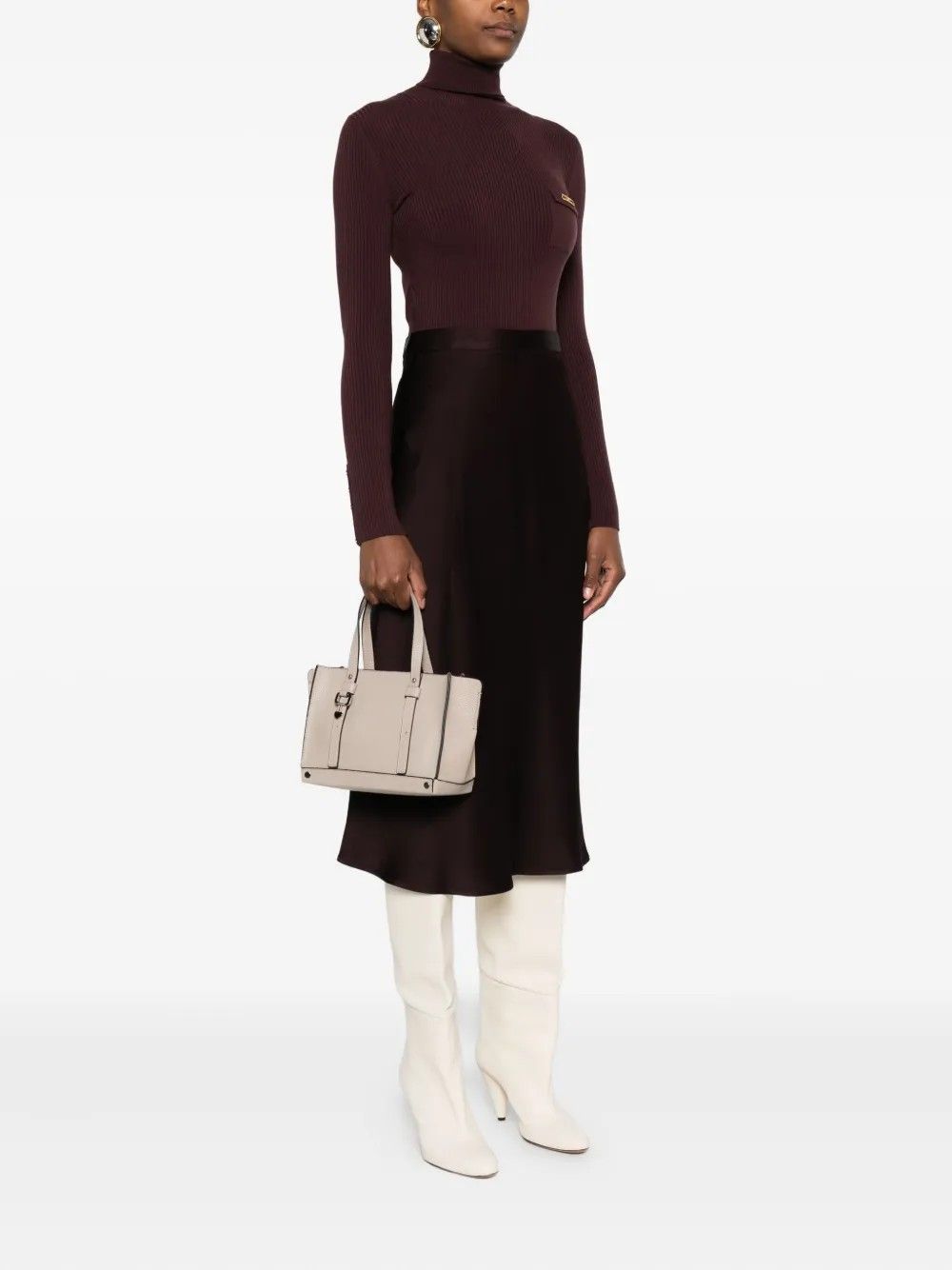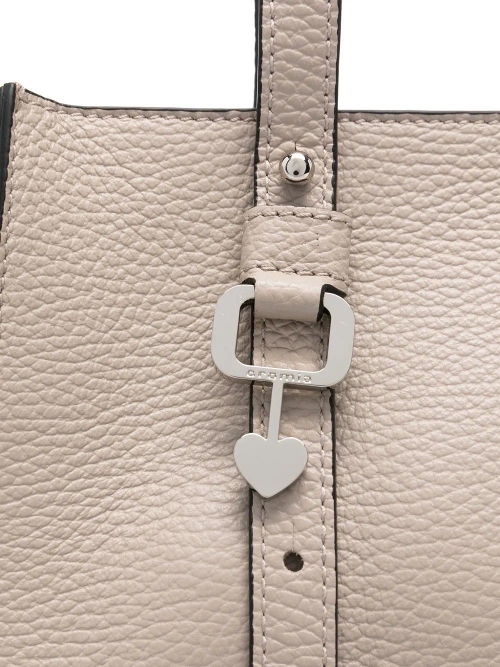 La borsa tote è realizzata in pelle con una silhouette compatta ed elegante, rifinita da manici rigidi e una tracolla rimovibile per una portabilità versatile.La chiusura con fibbia aggiunge un dettaglio funzionale dal gusto classico mentre il ciondolo a cuore in metallo arricchisce il design con un tocco romantico.Realizzata in Italia con cura artigianale,misura 17 cm in altezza,27 cm in larghezza e 12 cm in profondità.