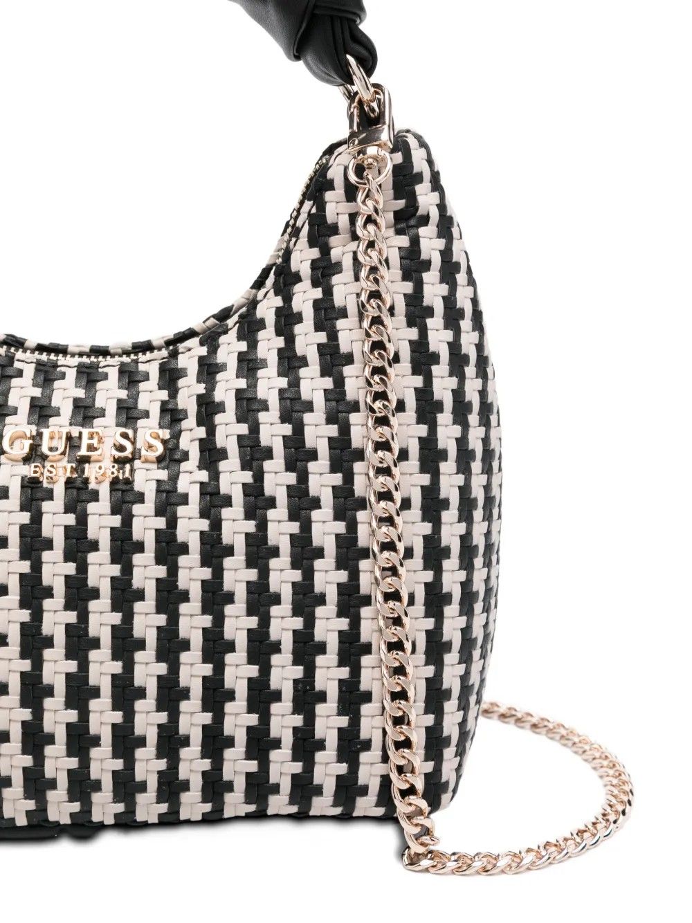 Scopri la borsa a mano di GUESS, un'icona di stile e funzionalità. Realizzata in un elegante tessuto intrecciato bianco e nero, questa borsa è ideale per completare ogni tuo look. Il suo design sofisticato è arricchito da una catena in metallo dorato, che aggiunge un tocco di lusso al quotidiano.