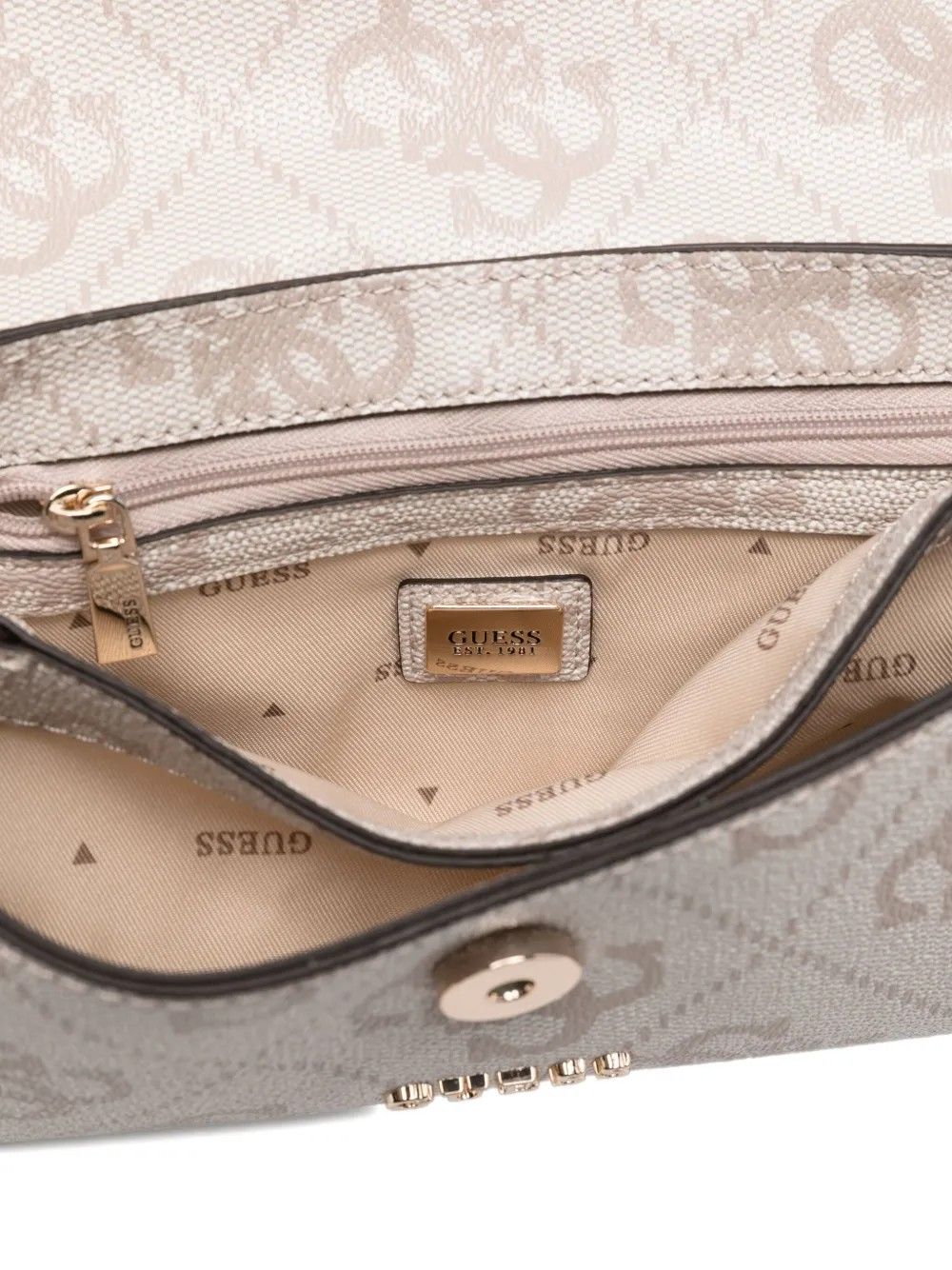 La borsa Guess da donna presenta una fantasia logata all-over e chiusura principale con patta per un look moderno e raffinato.Dotata di tasca posteriore con zip, è arricchita da dettagli metallici, ciondolo logo e lucchetto decorativo sul davanti.La struttura compatta la rende ideale per uscite quotidiane e serate essenziali.Le dimensioni 25x12,5x6 cm offrono spazio per l’essenziale, mentre la maniglia da 23 cm consente una portabilità comoda ed elegante.Realizzata con cura, unisce stile iconico e praticità in un unico accessorio.