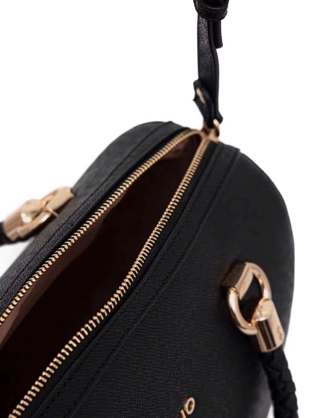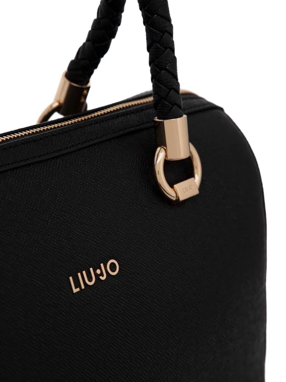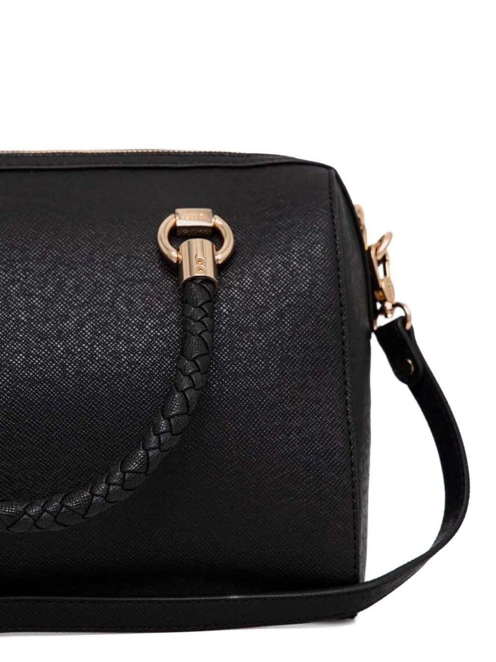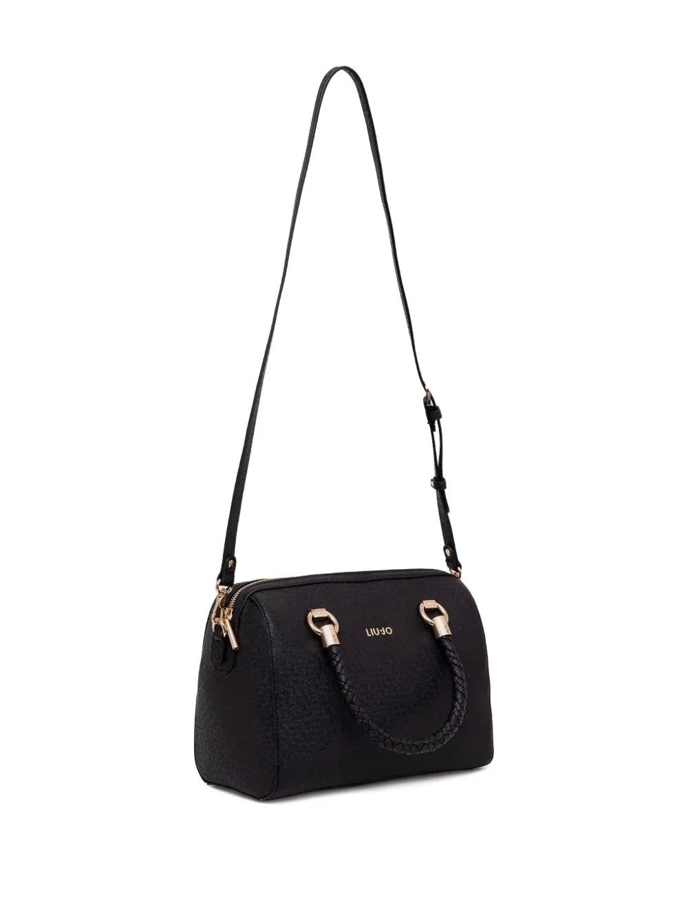 Borsa bauletto 30x15x21 cm con stampa effetto saffiano e logo lettering.Disponibile con manici intrecciati e tracolla removibile per un uso versatile.Dotata di ampio scomparto centrale e chiusura con zip.Design pratico e raffinato per ogni occasione.