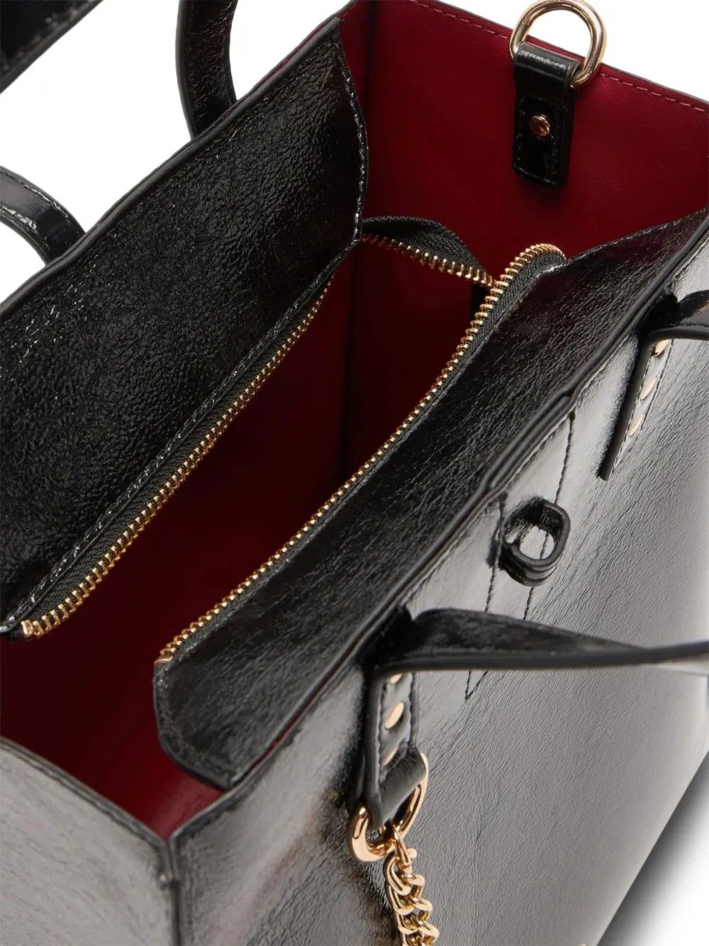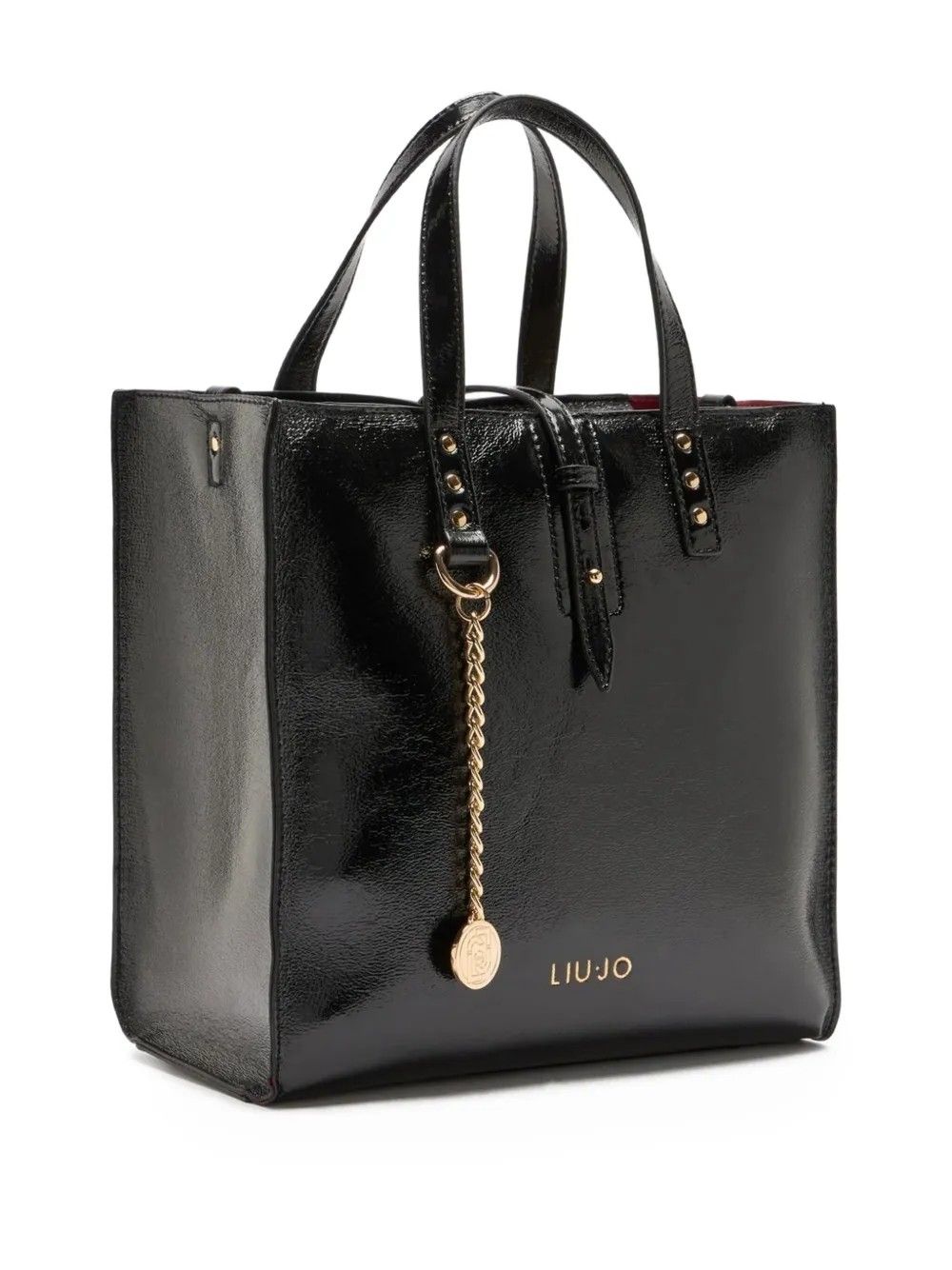 Borsa a mano lucida 25x14x26 cm con mini borchie applicate per un tocco grintoso e moderno. Dotata di logo in metallo, comodi manici e tracolla regolabile e rimovibile per vari modi di indossarla. Chiusura con zip e cinturino, interna fodera a contrasto. Accessorio versatile e sofisticato per ogni occasione.