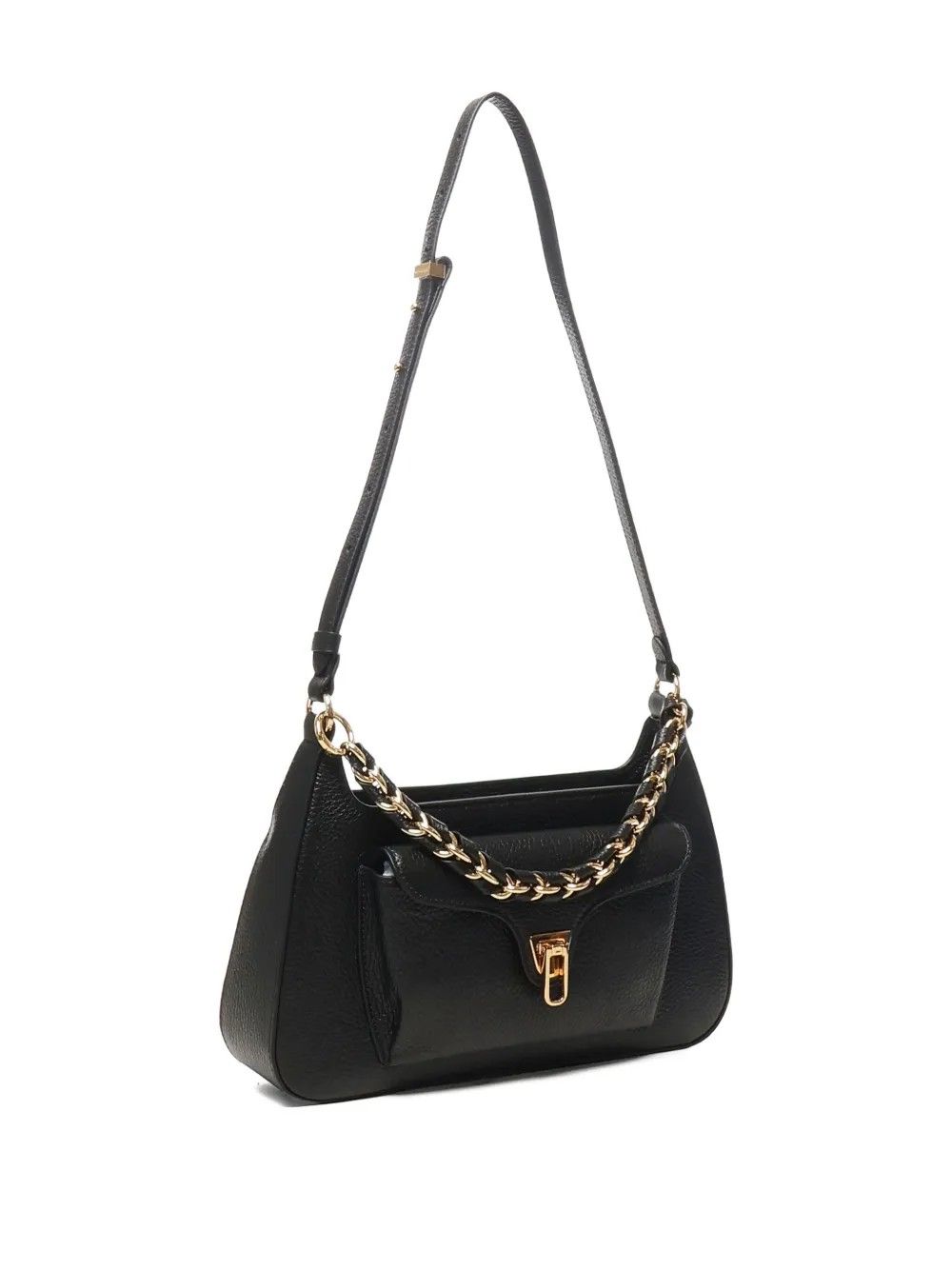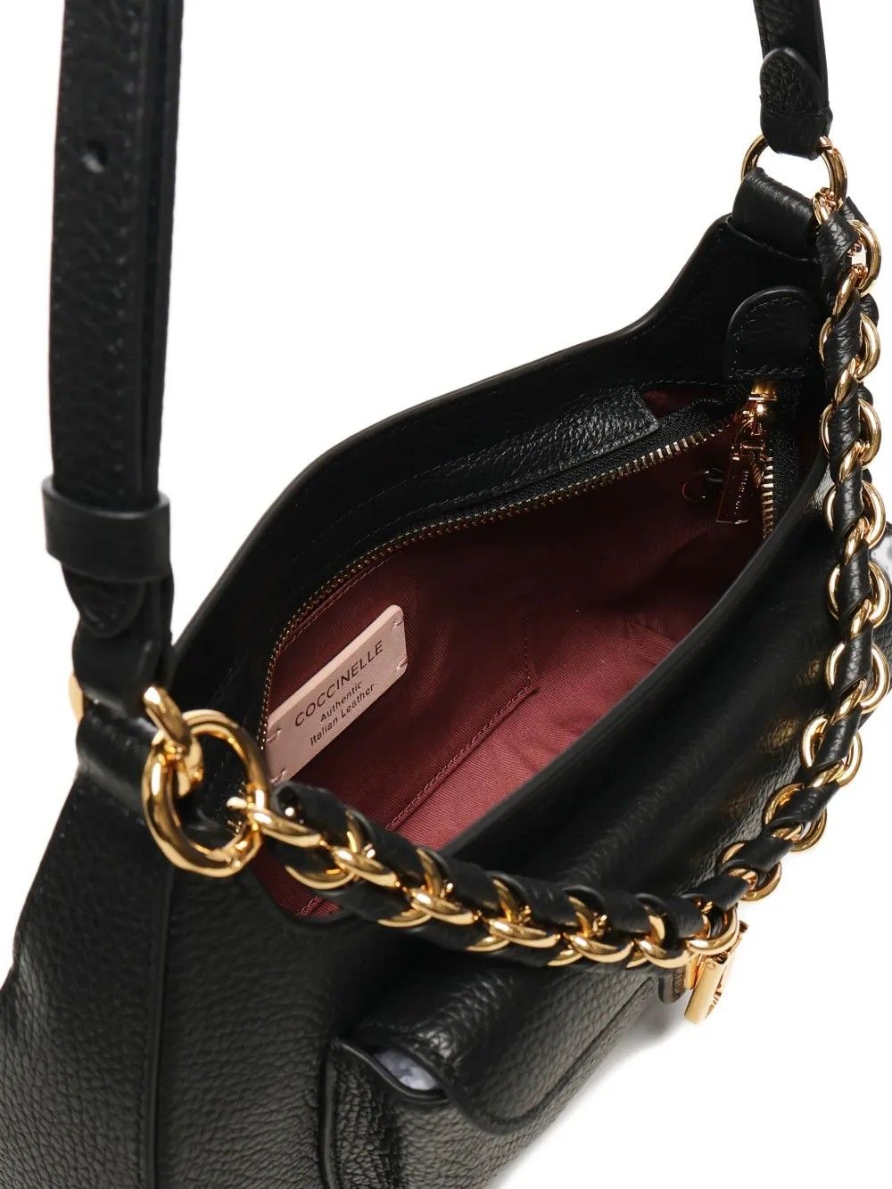 La borsa a spalla Coccinelle è realizzata in morbida pelle di vitello con un design curvo ed elegante. Il dettaglio decorativo a catena e la fibbia color oro aggiungono un tocco distintivo e femminile. Dotata di tracolla e tasca con patta frontale, unisce funzionalità e stile. Misura 30,5x15x6 cm, perfetta per accompagnare ogni look con raffinatezza.
