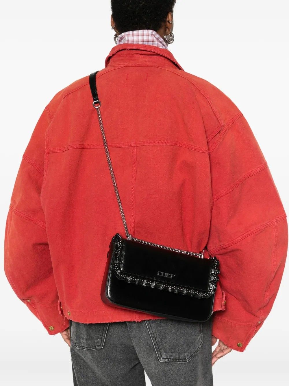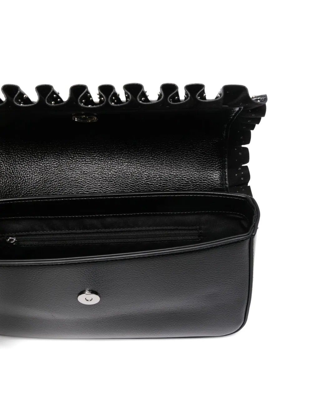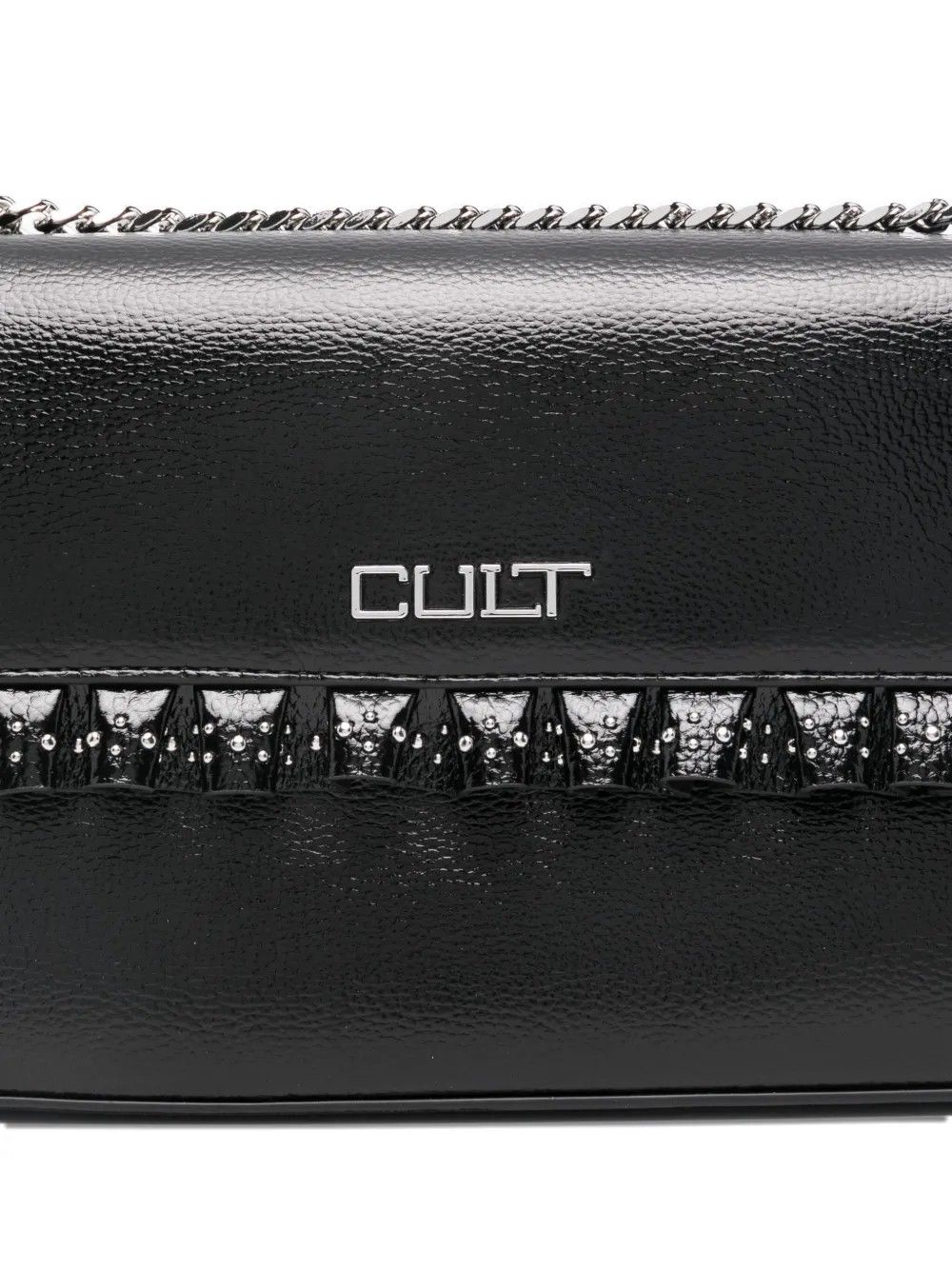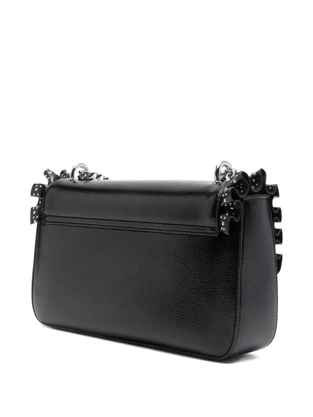 Romantica ma audace, questa borsa a spalla con patta si distingue per i bordi arricciati e la tracolla a catena, dettagli originali che la rendono unica. Compatta e versatile, misura 27x14x6 cm, perfetta per chi ama accessori dal carattere deciso e femminile. Realizzata in ecopelle 100%, unisce stile e funzionalitĂ .