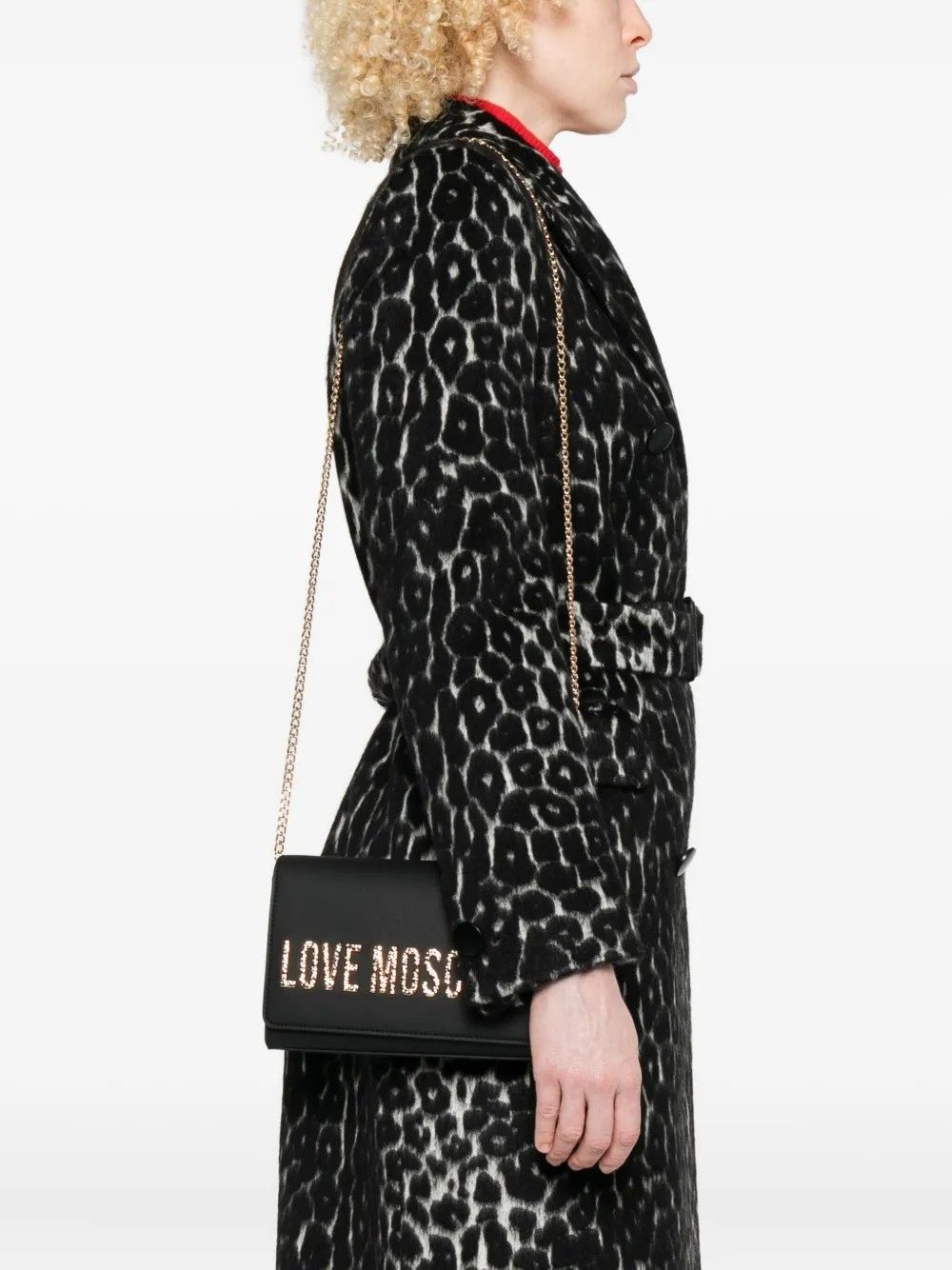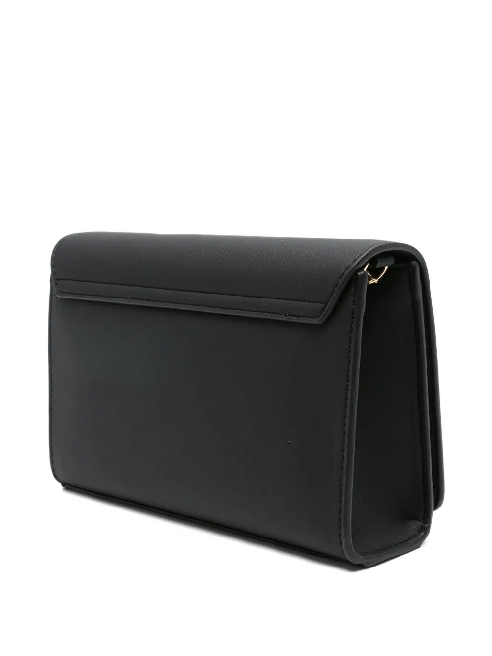 Borsa Love Moschino piccola e compatta in ecopelle nera, con chiusura a risvolto e clip magnetica. Il design minimalista e l’unico scomparto interno la rendono perfetta per l’uso quotidiano. Le dimensioni contenute di 23 cm di lunghezza, 14 cm di altezza e 6 cm di profondità la rendono ideale come accessorio elegante e funzionale, perfetto per completare ogni outfit con stile.
