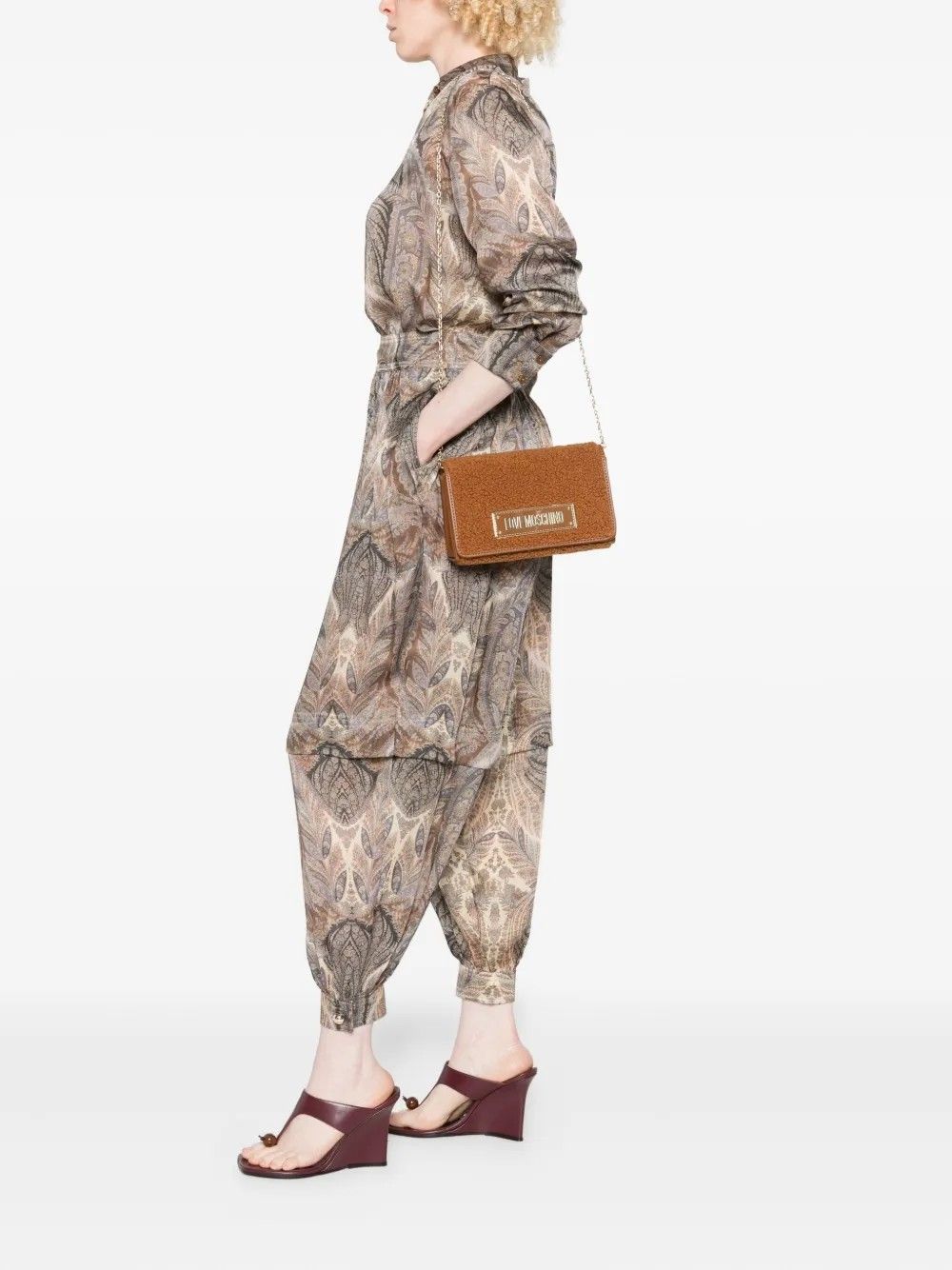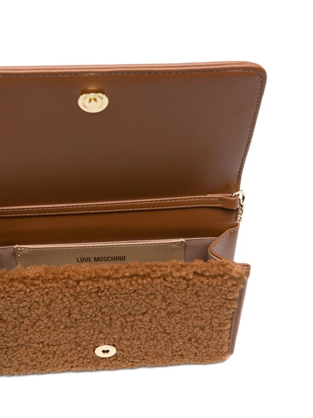 Borsa a mano Love Moschino di taglia media in materiale sintetico ed ecopelle, con chiusura a patella e bottone magnetico. Design elegante e funzionale, ideale per completare look quotidiani con un tocco di stile. Dotata di cinghia fissa senza possibilità di regolazione, perfetta per essere portata a mano o a spalla.