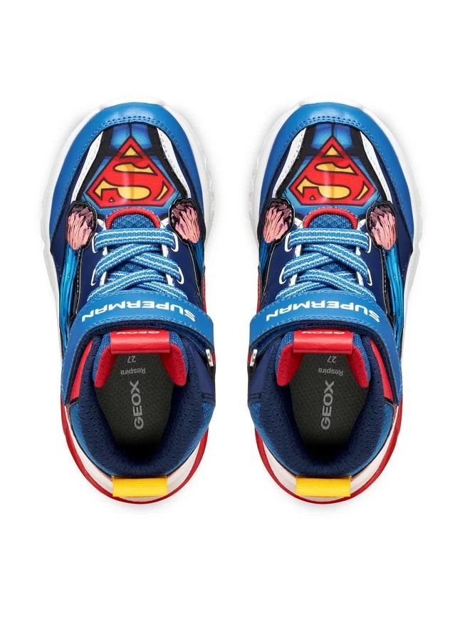Sneakers bambino firmate Geox dedicate al celebre supereroe superman. Realizzate in materiali traspiranti, combinano comfort e stile con grafiche ispirate al mondo DC Comics. Il sistema di chiusura con velcro e zip laterale facilita la calzata autonoma. La suola flessibile e ammortizzata assicura stabilità e libertà di movimento per il gioco quotidiano.