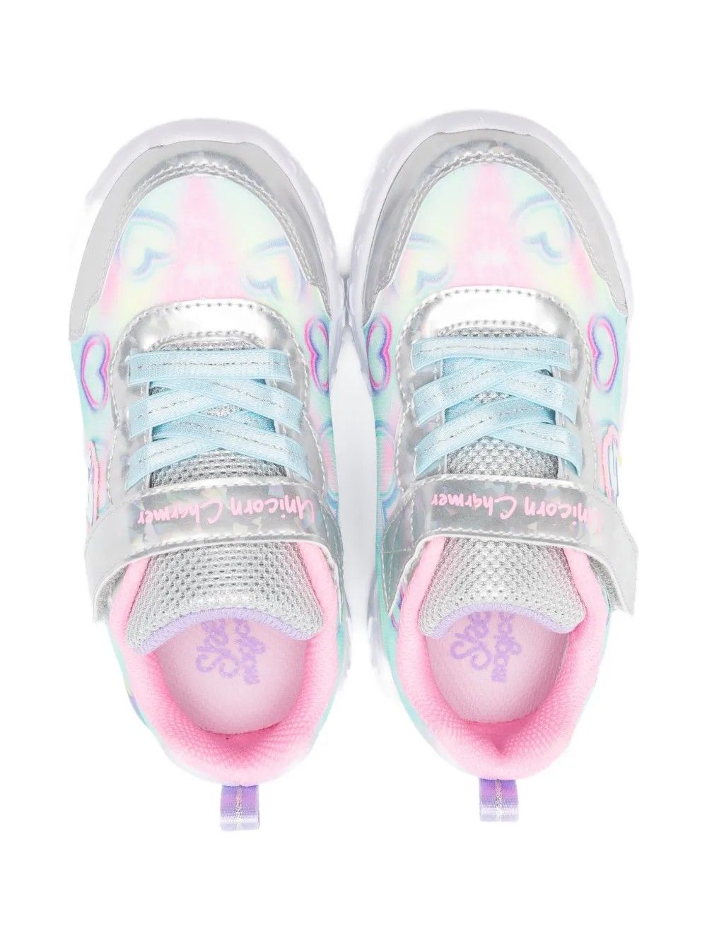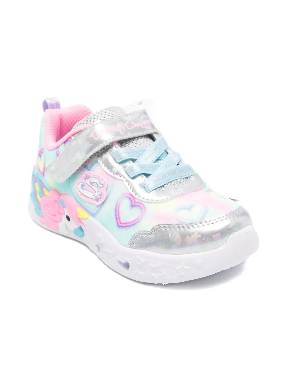 Le sneakers Skechers S-Lights Unicorn Dreams per bambini uniscono fantasia e praticità con dettagli a tema unicorno e motivi a cuore. Dotate di chiusura combinata con lacci e cinturino touch-strap, offrono una calzata sicura e confortevole, completata da una suola piatta in gomma.
